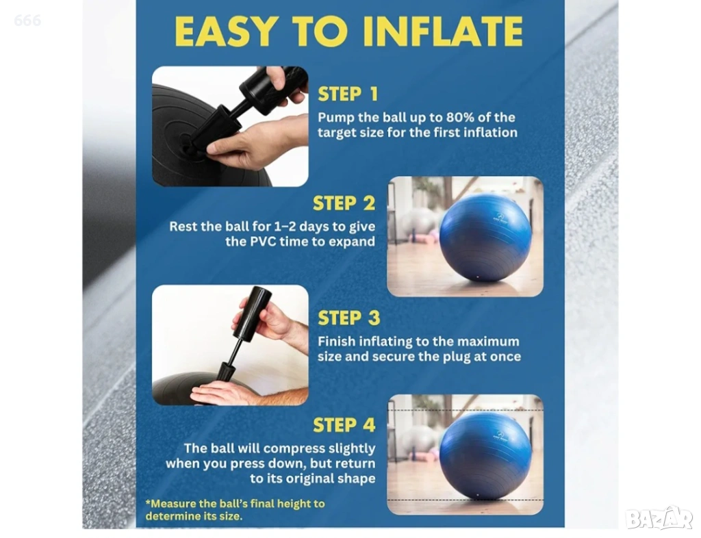 БЪРЗА НАСТРОЙКА И СТАРТ, ВКЛЮЧЕНИ УПРАЖНЕНИЯ И БЪРЗО НАПОМПВАНЕ - Големият терапевтичен физиобал се надува за минути с минимални усилия. Незабавно се насочете към бедрата, седалището, корема, тазовото дъно и други специфични мускулни цели.