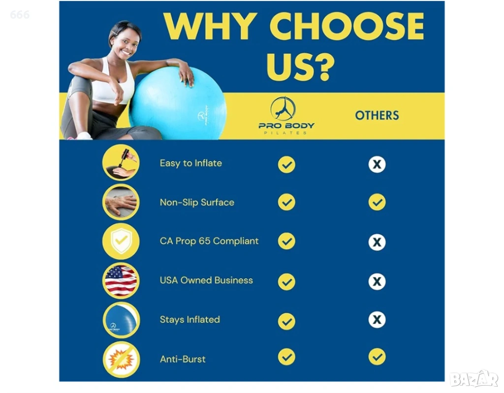 Устойчива на спукване и хлъзгане - топка за пилатес с тежък, дебел PVC дизайн, която може да издържи на най-натоварващите тренировки, йога или пилатес програми. Здрава швейцарска топка от PVC без гума, която се счита за устойчива на спукване до 2000 lbs.