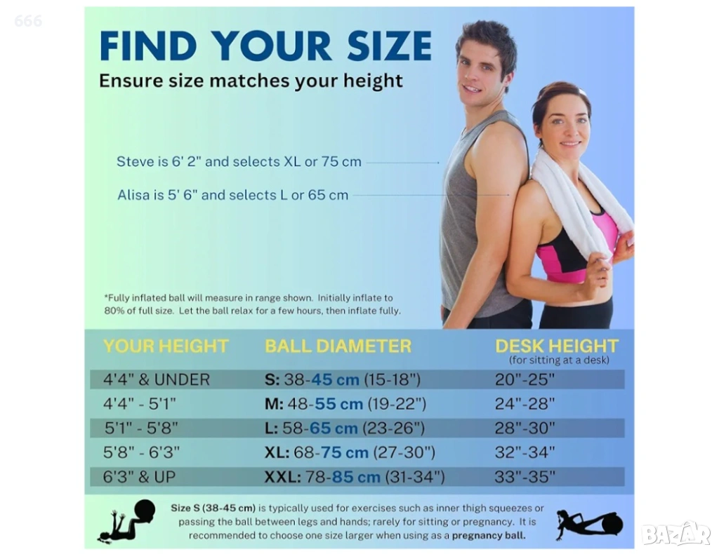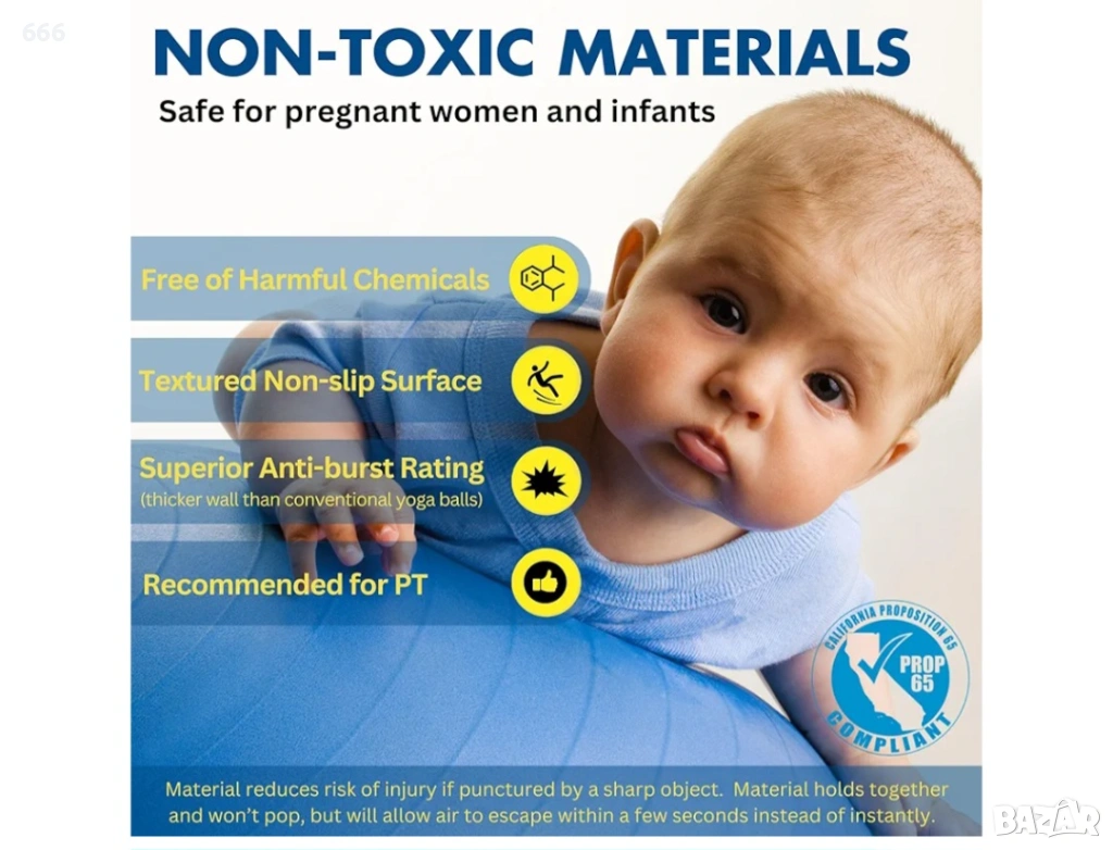 Висококачествен професионален материал: Топката за упражнения е изработена от мек PVC материал с ниска миризма, който не съдържа обикновени вредни фталати или други токсични добавки. Предлага се в 5 размера: 45 см, 55 см, 65 см, 75 см и 85 см.