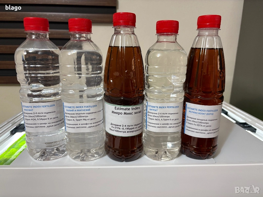 Комплекта се състои от 4 или 5 бутилки 500мл. по избор дали желаете допълнително Чисто желязо. (Нитрат,Фосфат,Калий плюс Магнезий, Микро микс хелат, Желязо Хелат)