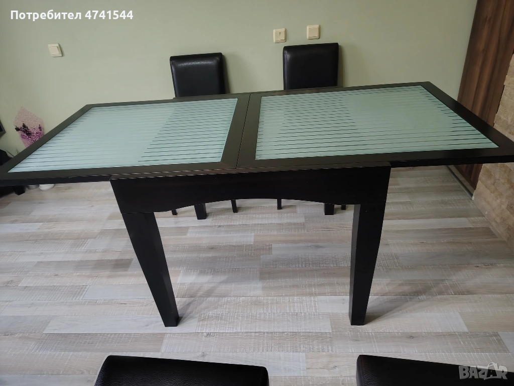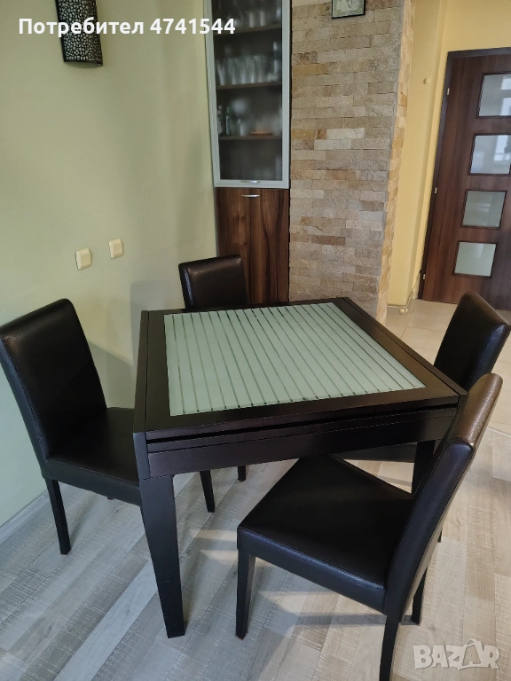 Продавам трапезна маса с четири стола.Масата има стъклен плот с хоризонтални линии,а краката са в тъмнокафяв цвят.Подходяща за всекидневна употреба в дома или офиса.Масата е здрава и има функция за разтягане.
