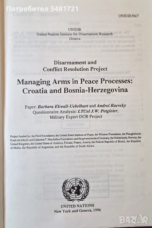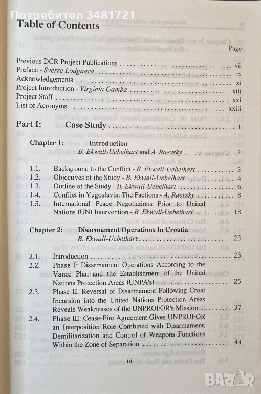 Книгата представя компонентите за демилитаризация и разоръжаване, върху които се фокусира мирната мисия на Силите за защита на ООН (UNPROFOR) през 1992ра-93та година в Хърватска и Босна и Херцеговина. Представени са операции в сектор Запад на ООН, Сребреница и зоната за забрана на тежките оръжия в Сараево, операциите генерално в двете държави, както и изводите от усилията в региона. Включена е също историята на конфликтите, карти и статистика, резултати от военните действия и мисията на ООН след тях.