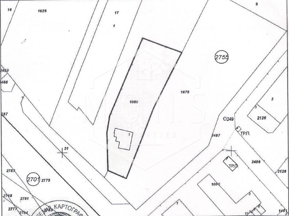 The total area of the property is 6614 m2. It consists of two plots - one with an area of 1729 m2 and the other with an area of 4885 m2. Facing two streets. Density - 40%. No elevation difference. Electricity and water are available.
