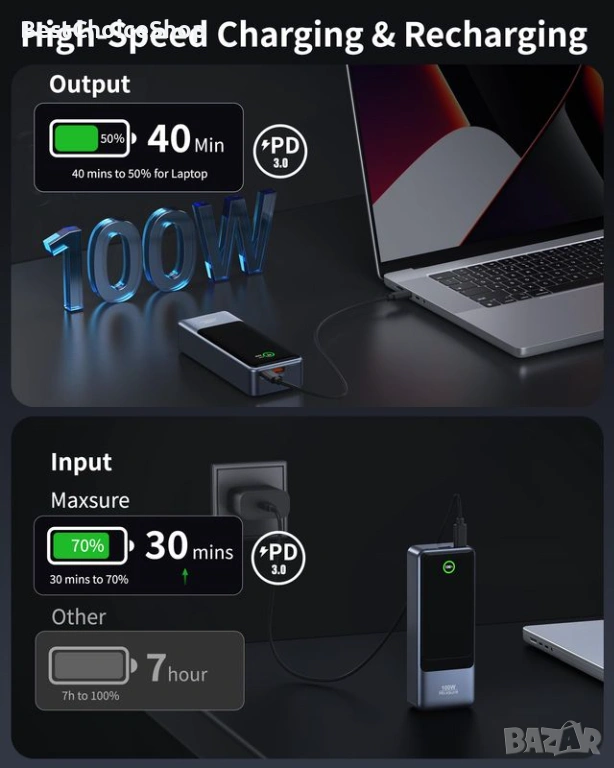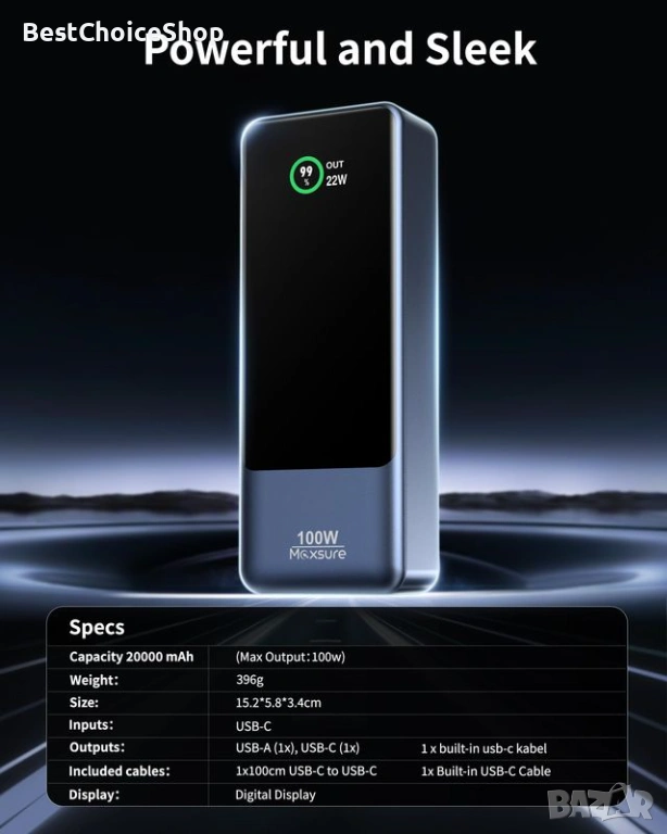 Maxsure 20000mAh Пауърбанк PD 100W USB-C Бързо Зареждане Цифров Дисплей
