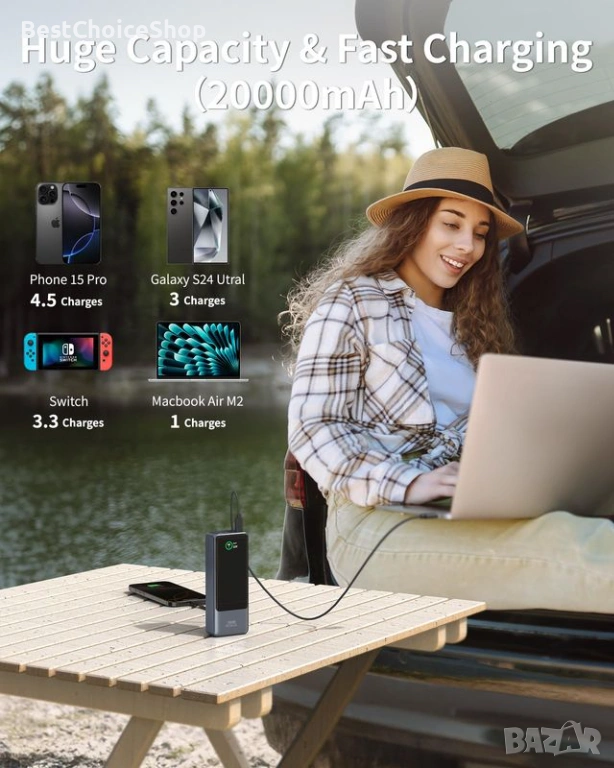 Продавам външна батерия с капацитет 20000mAh (72Wh), подходяща за телефон, таблет и лаптоп. Моделът разполага с вграден Type-C кабел и поддържа висока изходна мощност.