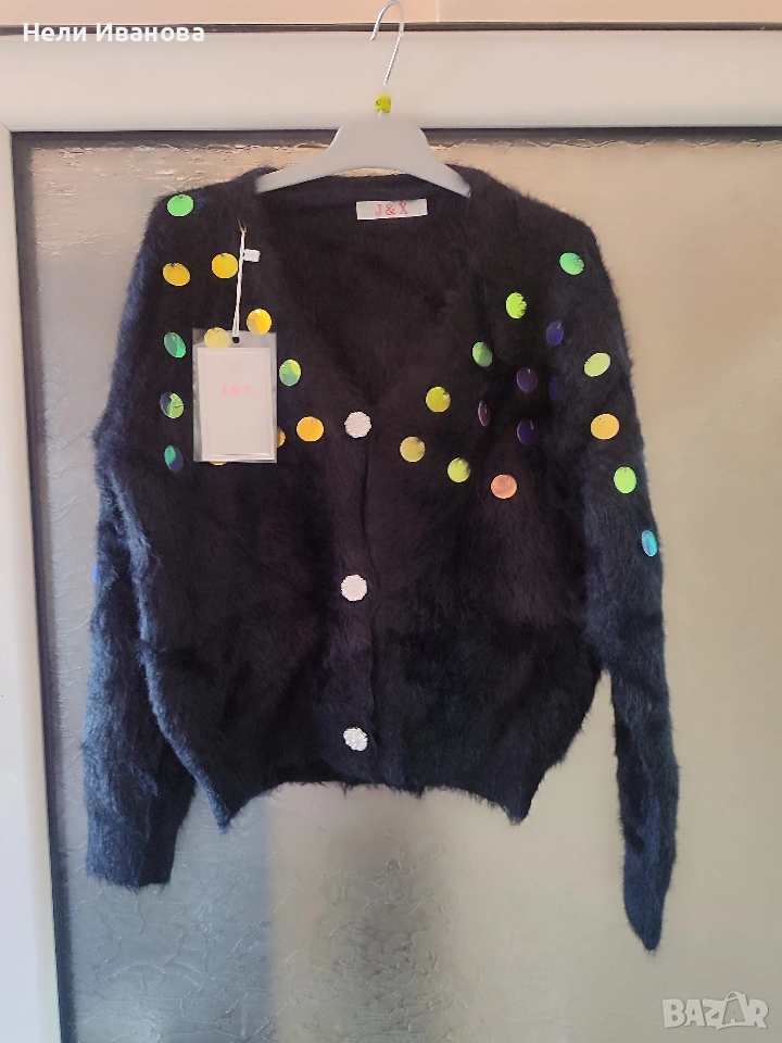 Дамска пухкава жилетка с големи люспи тип пайети.