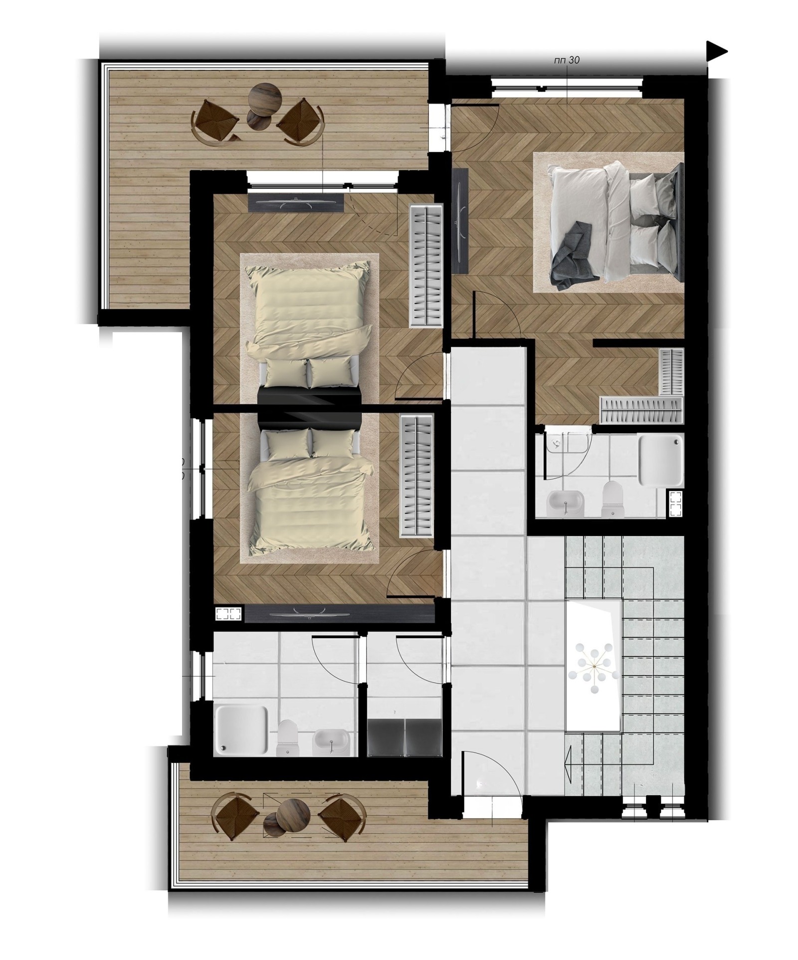 Оферта - 87014 Предлагаме Ви новострояща се къща в с. Войводиново. РЗП 191 кв.м. Парцел 212кв.м. Състои се от Първи етаж: хол с кухненски бокс и трапезария, склад, баня и тоалетна, килер, веранда; Втори етаж: три спални, една от които със собствена баня и тоалетна и гардеробно помещение, отделна баня и тоалетна, перално, две тераси, паркомясто.