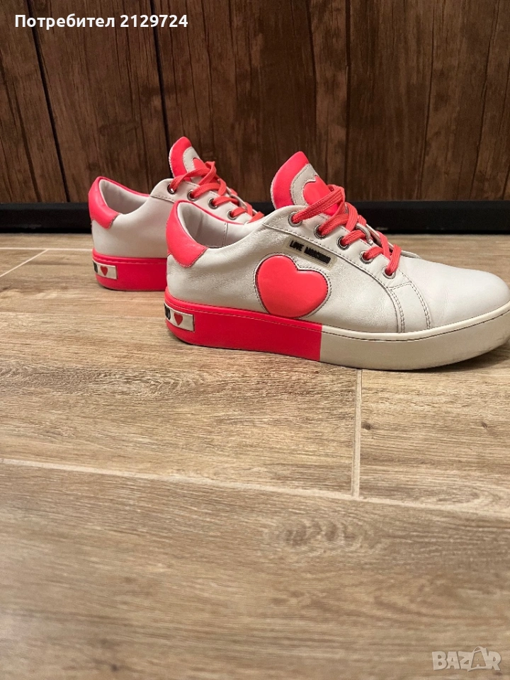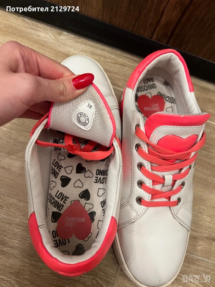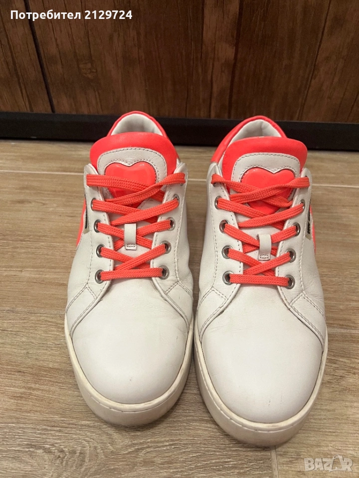 Бели сникърси Love Moschino с искрящо цикламени сърца, изработени от естествена кожа. Размер по етикет-38, но реално отговаря на 39. Много са ефектни, също меки и удобни за носене. Цена: 77 евро