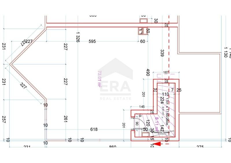 Вътрешни стълби отвеждат до второ ниво с площ 73 кв.м., представляващо покривна тераса. Към имота има прилежащо складово помещение с площ от 9 кв.м.