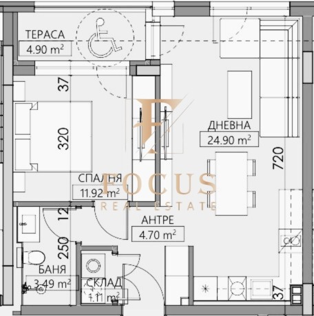Апартаментът е с обща площ от 70,32 кв.м. със следното разпределение: антре, хол с кухненски бокс, спалня, баня с тоалетна, склад и тераса.