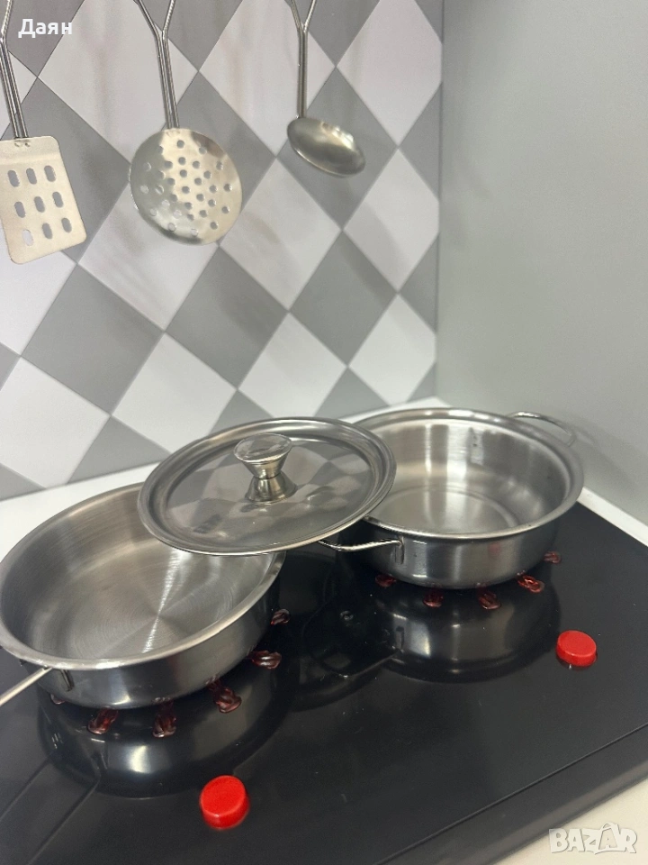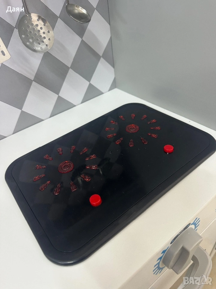Интерактивният комплект е оборудван с котлони, които светят и издават автентични звуци от готвене – така децата ще се почувстват като истински шеф-готвачи. Освен това копчетата издават щракащ звук при завъртане. Забележка: Необходими са 2 батерии ААА (не са включени в комплекта).