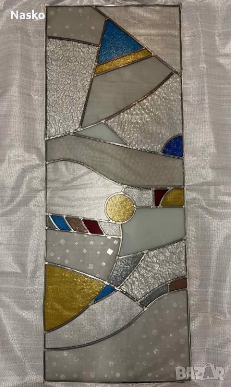 Декоративни стъклени пана с абстрактен геометричен дизайн, съставени от различни оцветени стъклени елементи. Паната са изработени в стил витражно стъкло / стъклопис и са от офиса на Владимир Грашнов на Балша.