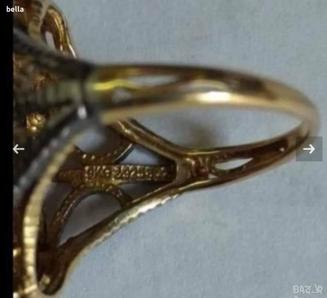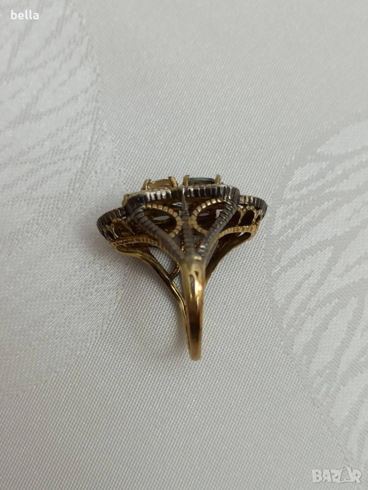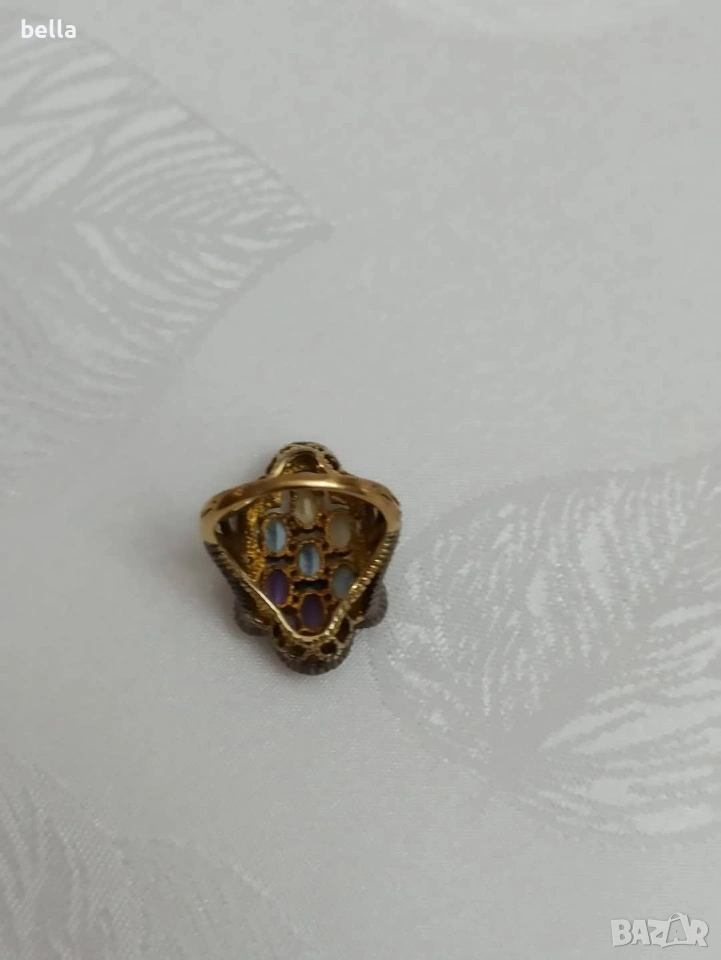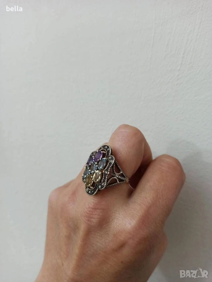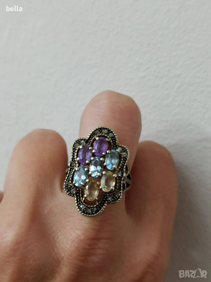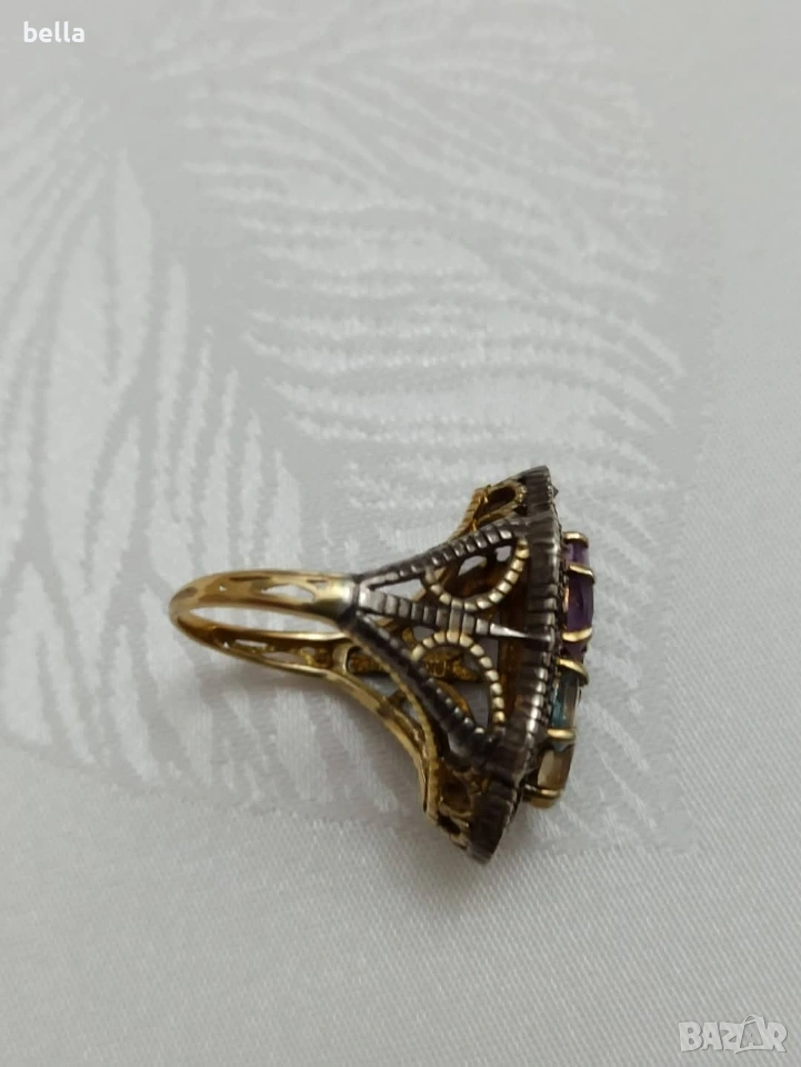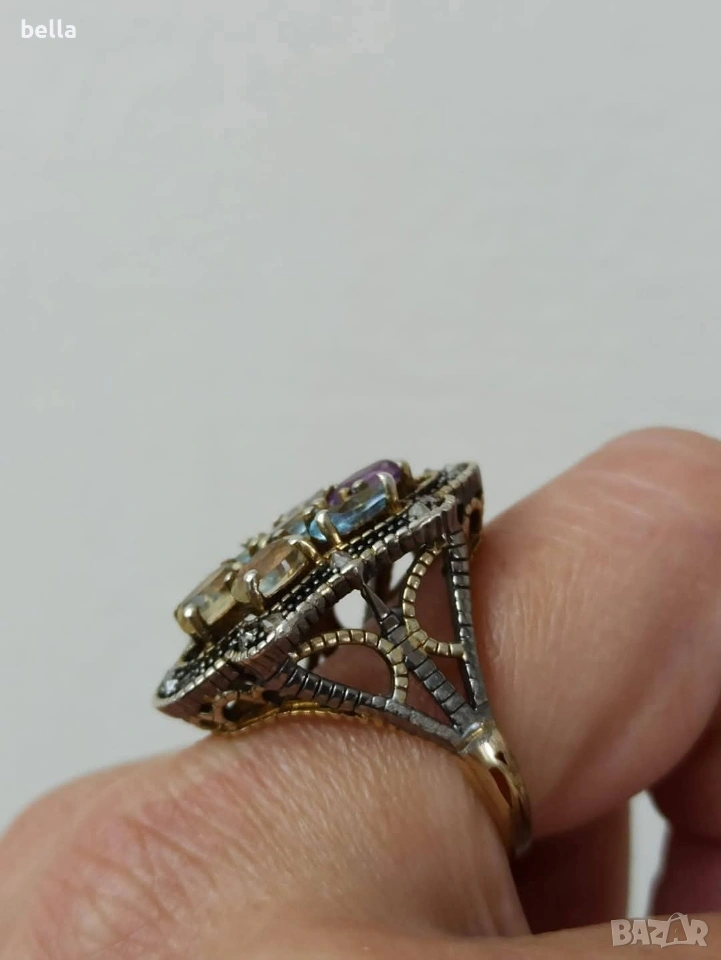 Уникална изработка на златен пръстен със сребро и инкрустирани малки диамантчета отстрани-отгоре има два камъка цитрин ,три аквамарин и два аметиста,самата изработка изцяло е уникална ,маркировки за злато и сребро -9KG 925S,размера е 1,8 см диаметър,8 грама,на ръката поставен седи стилно и елегантно.Цена 1000 евро