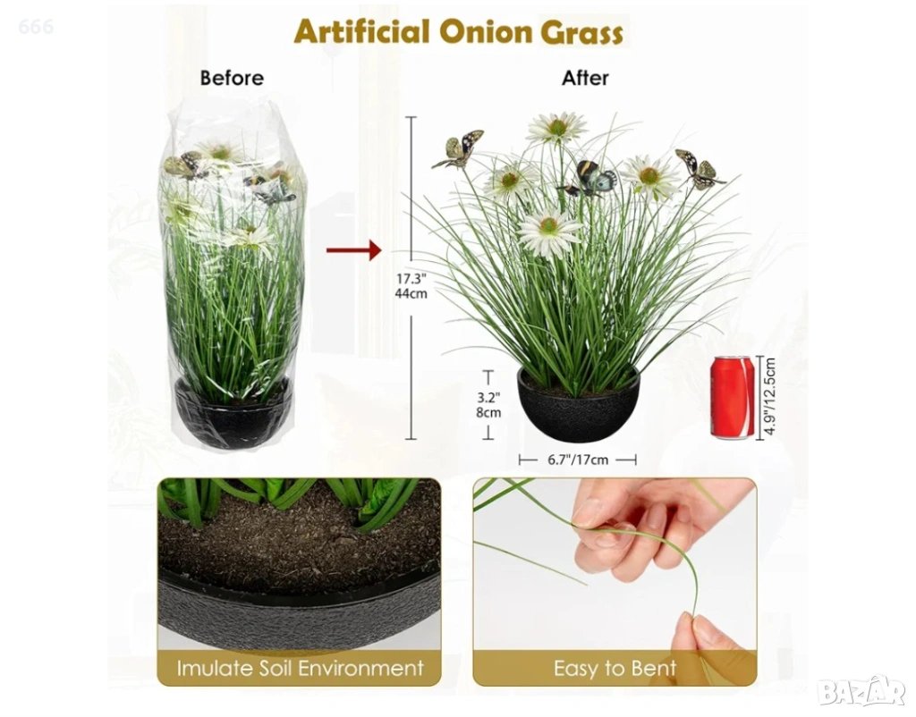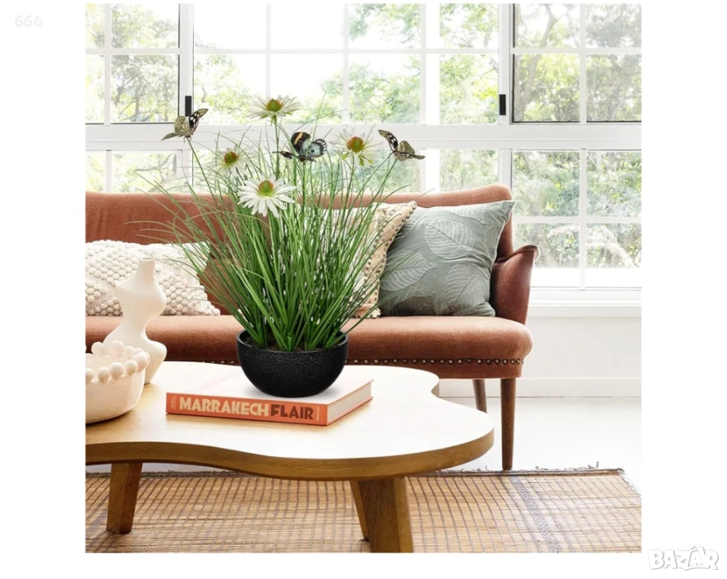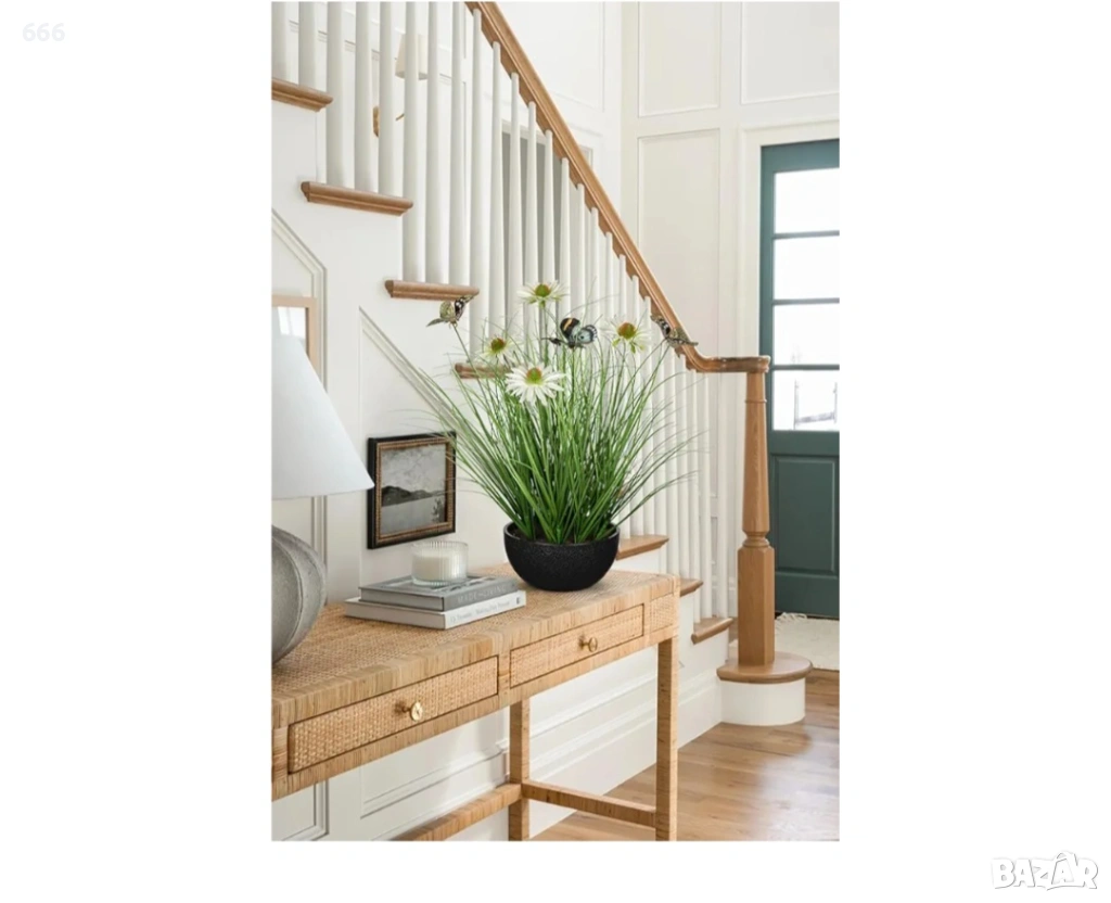 Реалистичен естествен вид - Нашите изкуствени стайни растения са проектирани да се доближават до истинската лучена трева, с ярки и реалистични бели маргаритки, съчетани с тънки и буйни зелени листа на лучена трева, цялото излъчва естествена и свежа атмосфера. Стратегически разположени пеперуди на различна височина и позиции допълват стройните линии на изкуственото тревно растение, сякаш пеперуди грациозно кацат или пърхат наоколо, добавяйки жизненост и енергия към изкуствените саксийни растения.