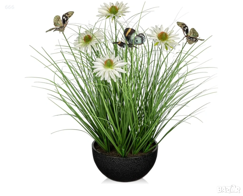 Превъзходно качество - Маргаритките и пеперудите са изработени от висококачествена коприна, изработена с усъвършенствани техники, цветята и пеперудите се отличават с живи цветове и реалистична текстура. Листата лук са изработени от висококачествена пластмаса, демонстрират зелено растение за реалистичен вид и усещане, което го прави трудно различен от други малки изкуствени растения. Предлага се с черна овална саксия с матирана текстура, контрастираща с ярко оцветените цветя и засилваща визуалната йерархия.