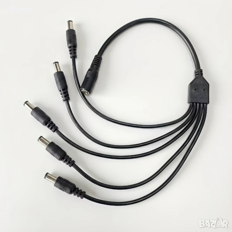 2,1 mm DC щепсел (женски) : Това е женският край на кабела, т.е. щепселът, който се свързва към захранването или друго устройство, съвместимо с 2,1 mm DC щепсел.