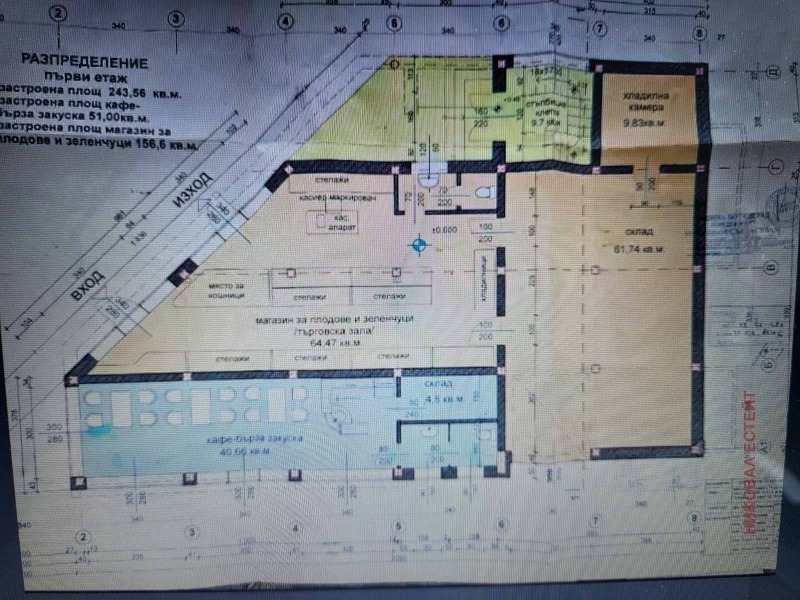 Първи етаж - 243,56кв.м. РЗП ,разпределени като магазин за плодове и зеленюуци и кафене - бърза закуска.