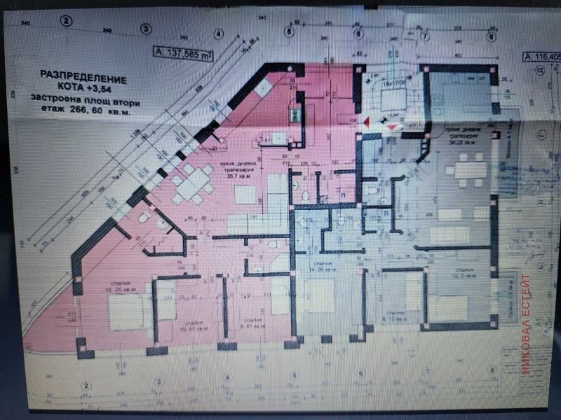 Втори етаж - 266.60кв.м. РЗП ,разпределени в два апартамента. Първият 137,59кв.м и вторият 116,41кв. м. Общи части- нисък процент- 42кв.м. за цялата сграда.