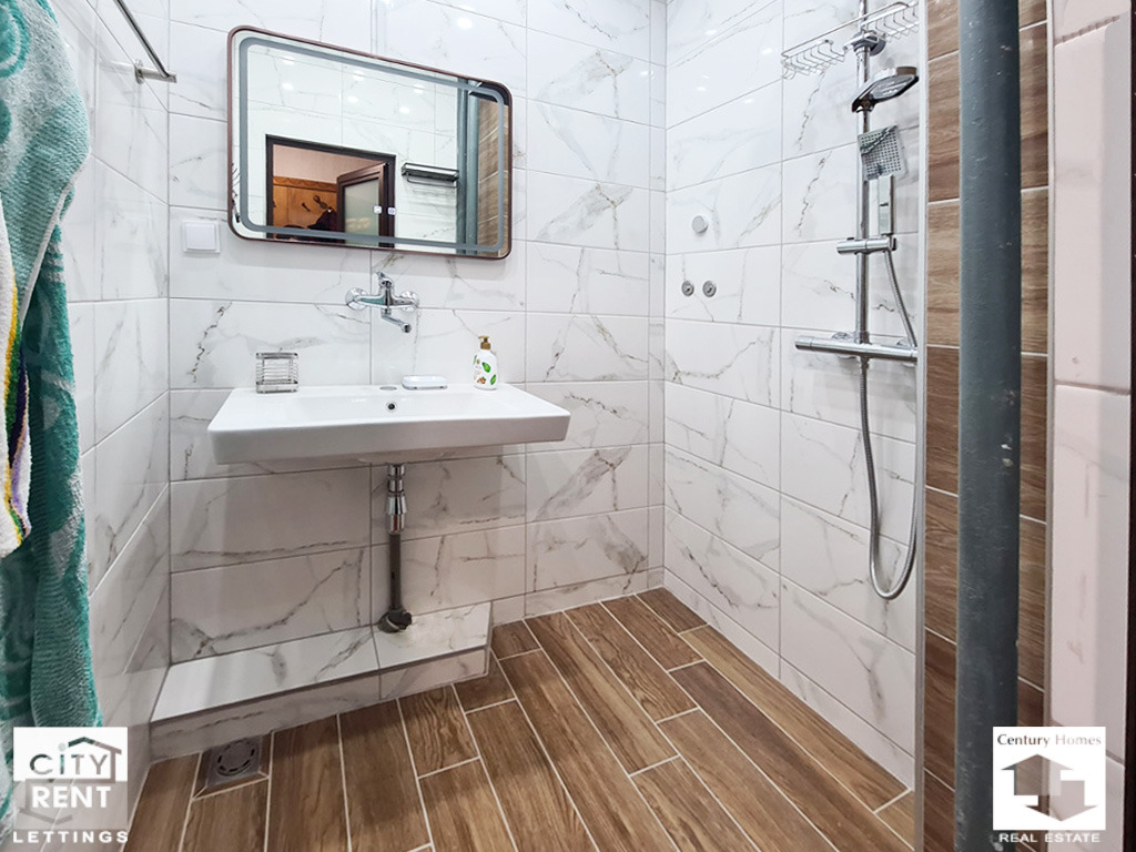 Интериорът е поддържан и практичен подовите настилки са паркет и гранитогрес, стените са боядисани с латекс, дограмата е PVC, а вътрешните врати са дървени. Апартаментът се отдава напълно обзаведен, като на разположение на наемателите са пералня и радиатор. Сградата е с външна изолация и централно отопление, което гарантира комфорт през зимните месеци.