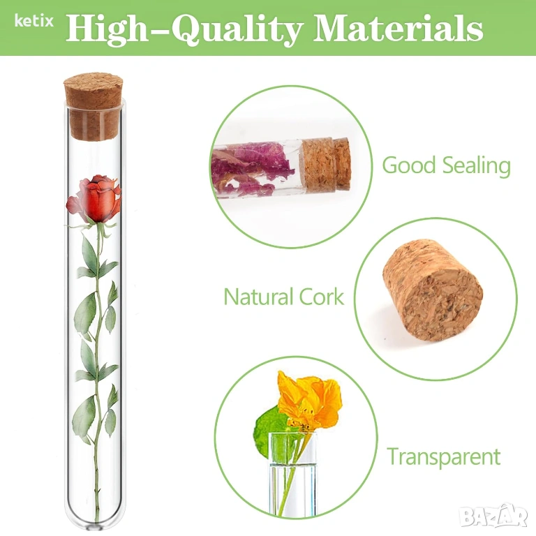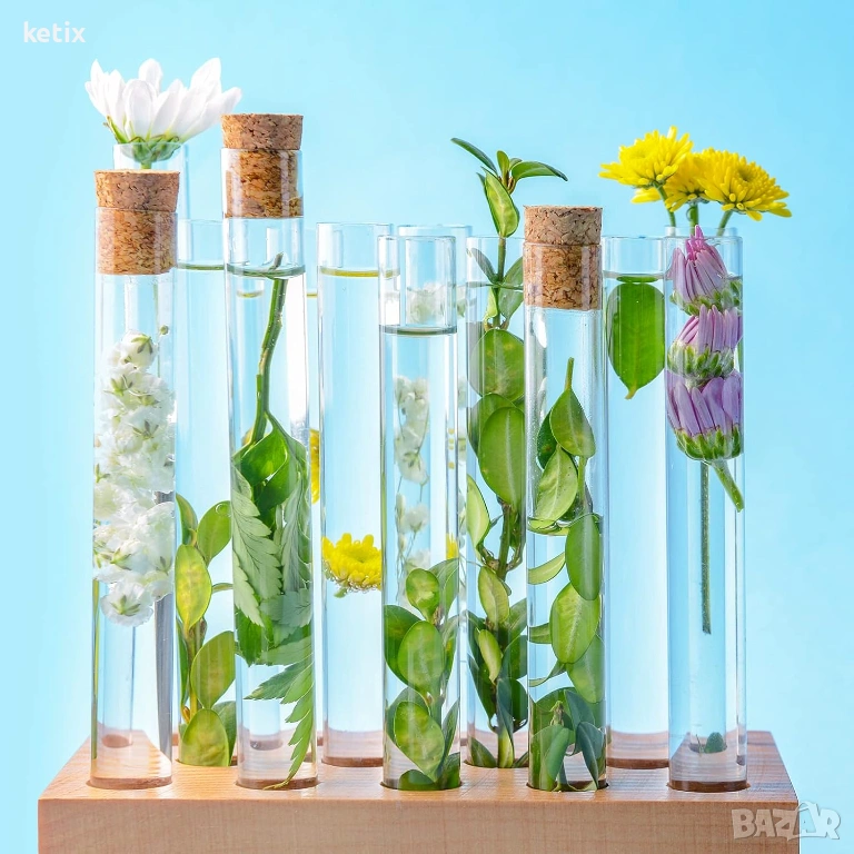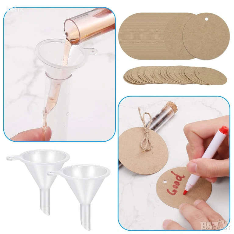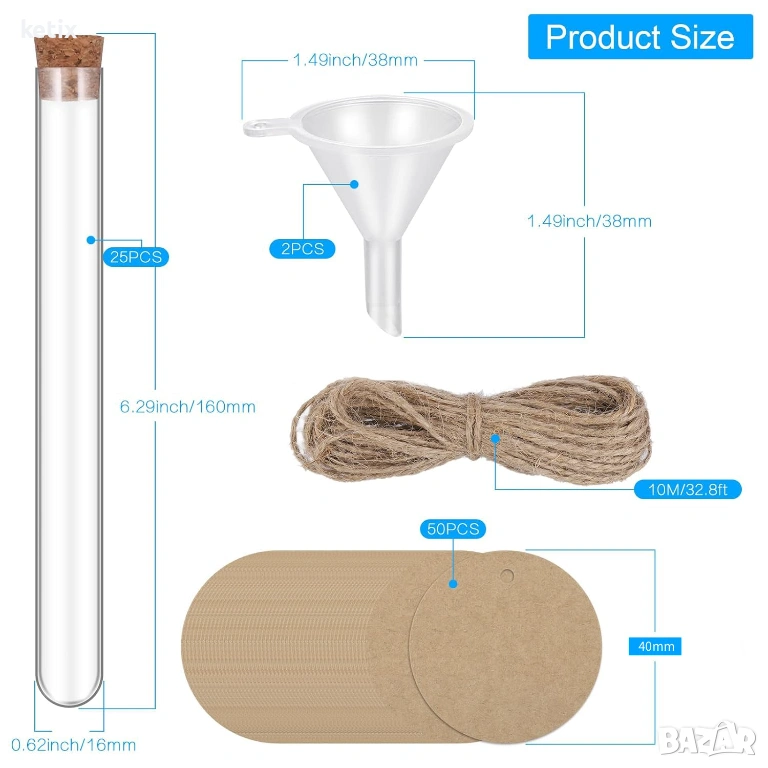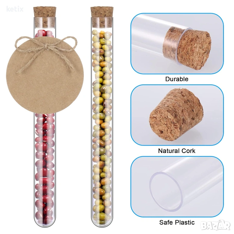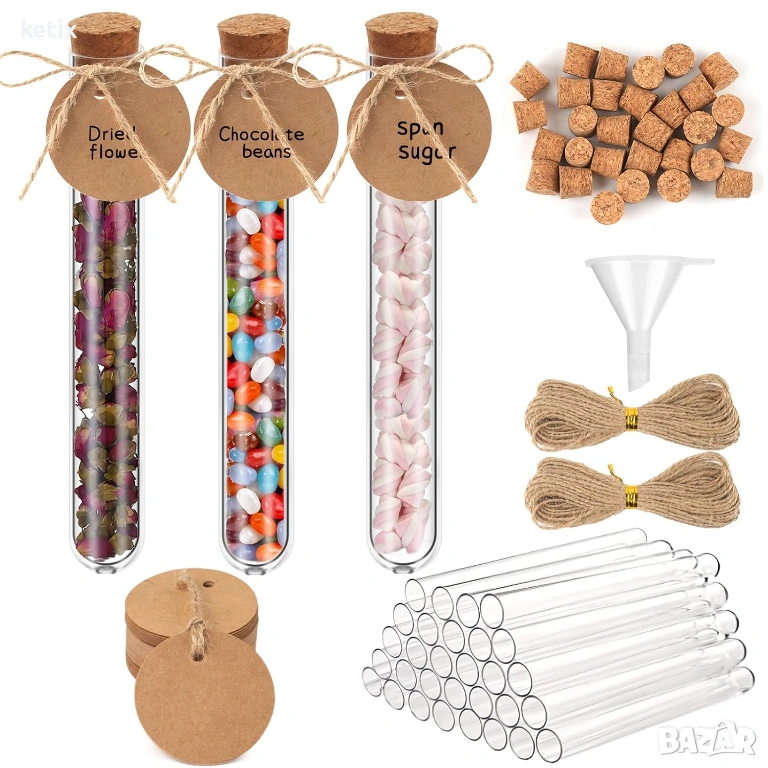 Прозрачни пластмасови епруветки от 20 мл: Опаковката съдържа 25 броя прозрачни пластмасови епруветки от 20 мл (150 x 16 мм) с 50 етикета от крафт хартия, 10 м конопено въже и 2 фунии, достатъчни за ежедневна употреба и подмяна.