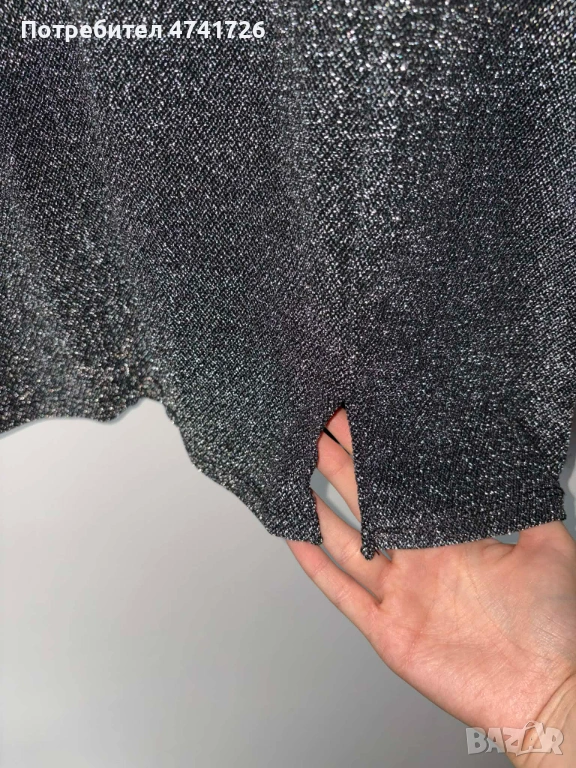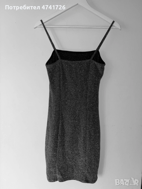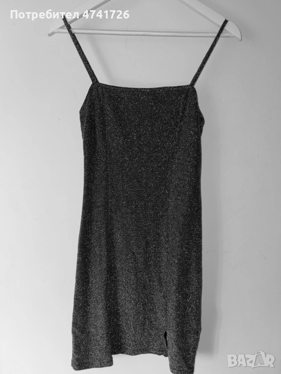 Къса вечерна дамска рокля в черен цвят със сребърен блясък. Размерът е S/36. Има много къса и деликатна цепка на левия крак. Марката на роклята е HM.