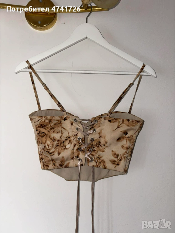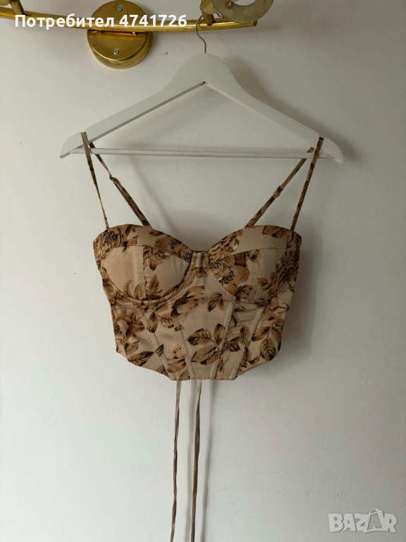 Топ корсет с флорален дизайн. Размерът е XS/34. Иползван е, но без никакви забележки. Презрамките са регулираеми, а самият топ е много удобен с панделка, което може също да се регулира.