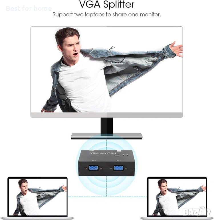 VGA превключвателят ви позволява да споделяте монитор между два лаптопа, като ръчно натиснете долната или горната част на превключвателя. Когато имате нужда два лаптопа да споделят монитор, няма нужда да разхлабвате и затягате отново VGA кабела. Едно просто нещо улеснява живота.