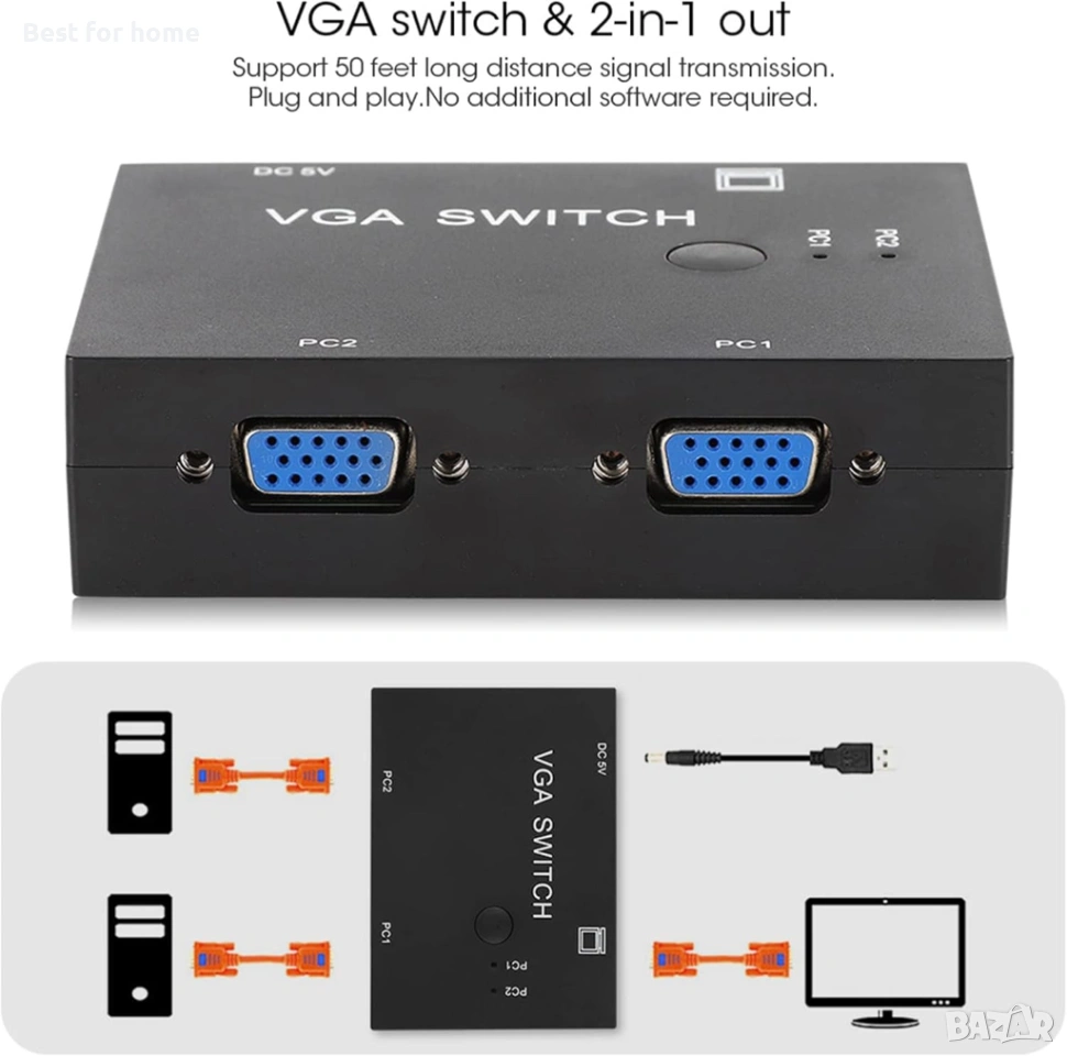 Превключвателят с 2 входа и 1 изход е plug and play, не е необходим друг софтуер за поддръжка на VGA, XVGA, SVGA, UXGA и мултисинхронизиран дисплей. DDC, DDC2, DDC2B не се поддържат, така че два компютъра споделят един дисплей и проектор.