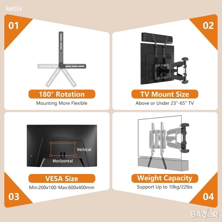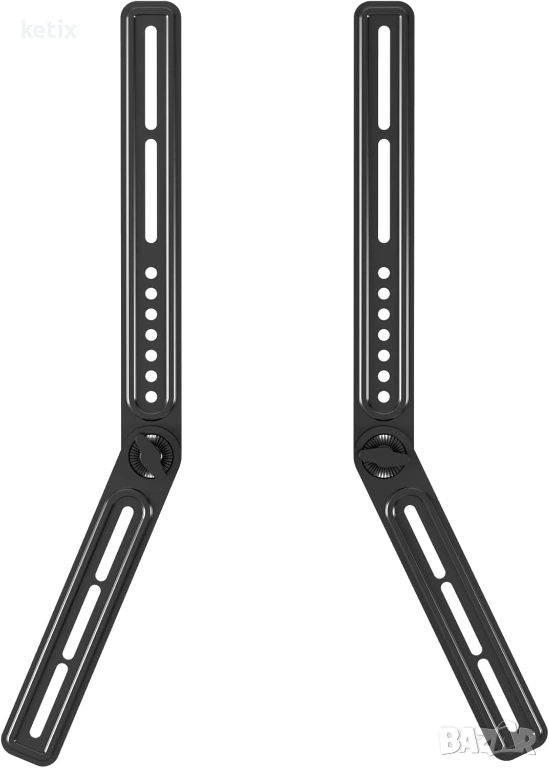 Гъвкава поставка за саундбар – Нашата поставка за саундбар не е само поддържащ аксесоар, но и ваш партньор за оптимизиране на качеството на звука. Тя предлага гъвкавост за различни нужди и максимална адаптивност. Настройките без инструменти са лесни – едно просто завъртане на копчето ви позволява да завъртите саундбара до 180°, за да осигурите прецизно позициониране за най-добро звуково изживяване по време на филми, музика и игри.