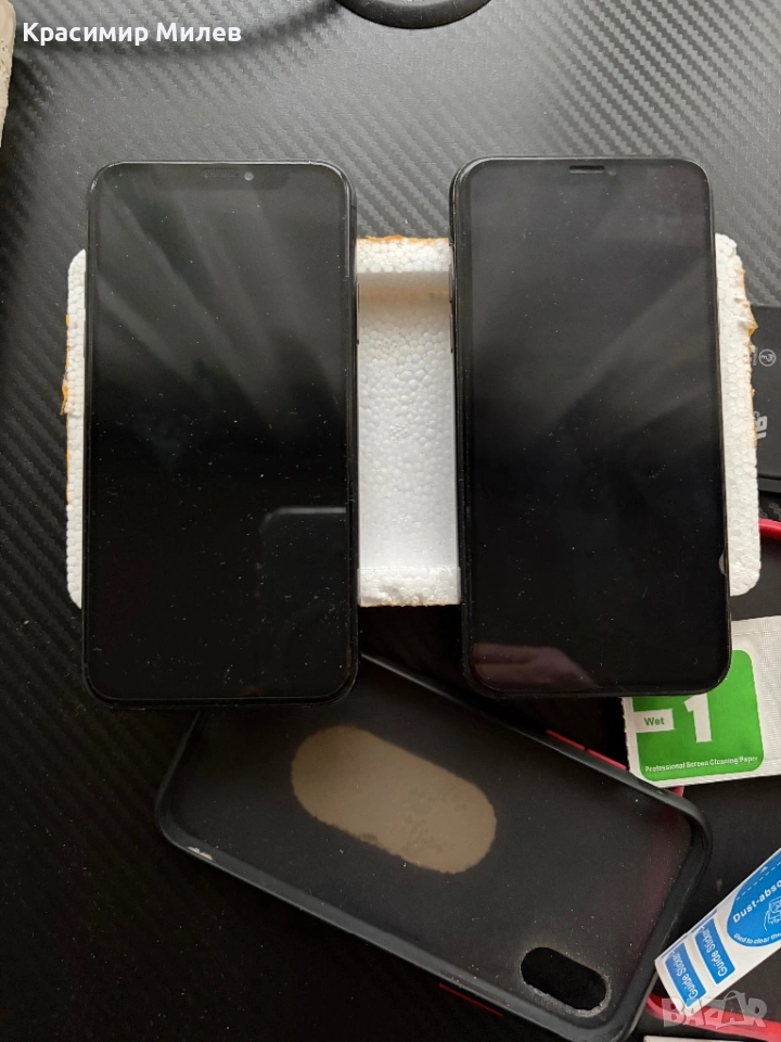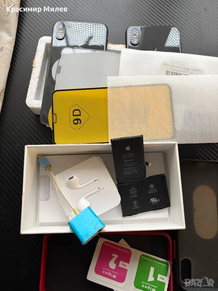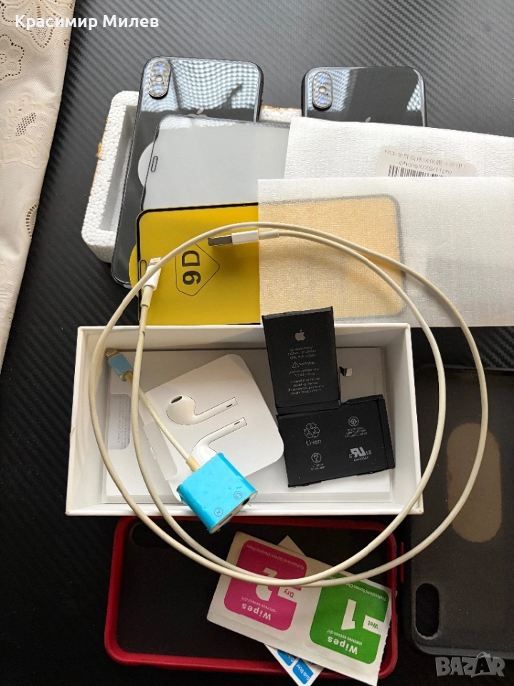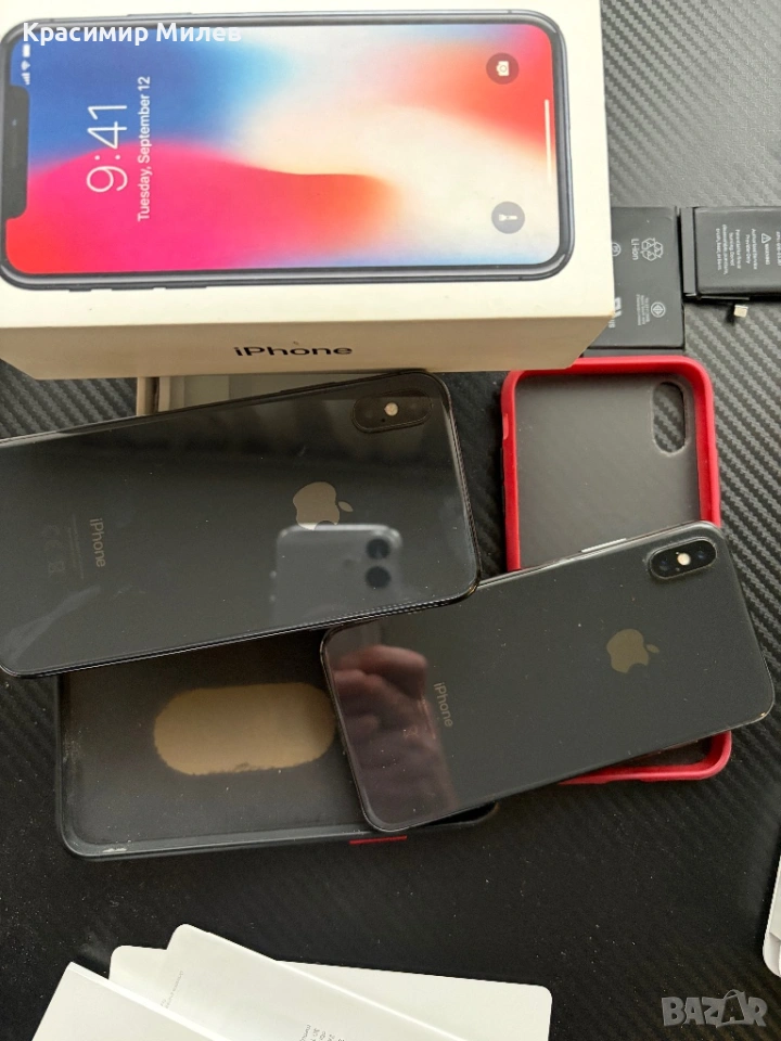 2 броя смарт телефони iPhone X .Единият е в отлично състояние.Другият (заключен,забравени имейли пароли)има всичко за резервни части.Работещият е с кутия,има протектор на дисплея,има два чисто нови стъклени протектора от най висок клас.има два предпазни калъфи ,слушалки Apple,преходник за зареждане и слушалки(аудио жак) заедно,3 кабела за зареждане по 3 метра и един оригинален. Има и отделна батерия (до 80%).Apple iPhone X (2017) е емблематичен модел с 5.8-инчов Super Retina OLED дисплей без рамки и прорез (notch) за Face ID, отбелязващ 10-годишнината на iPhone. Устройството се отличава със стъклен гръб, рамка от неръждаема стомана, мощния чип A11 Bionic, 3GB RAM и двойна 12MP камера. Поддържа безжично и бързо зареждане. Ключови характеристики на iPhone X: Дисплей: 5.8-инчов OLED Multi-Touch дисплей, резолюция 2436 x 1125 пиксела, HDR, 3D Touch. Процесор: A11 Bionic чип с 64-битова архитектура, невронен двигател (Neural Engine).