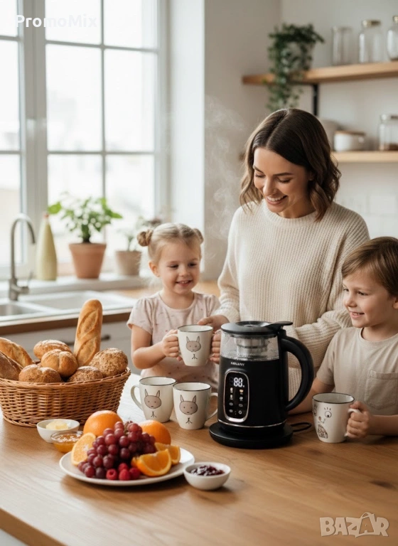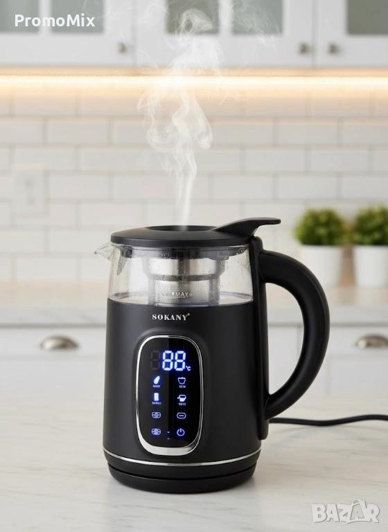 Ел. кана разполага с дигитален дисплей за прецизен контрол на температурата, индикатор за нивото на водата и вътрешен миещ се филтър против варовик от неръждаема стомана.