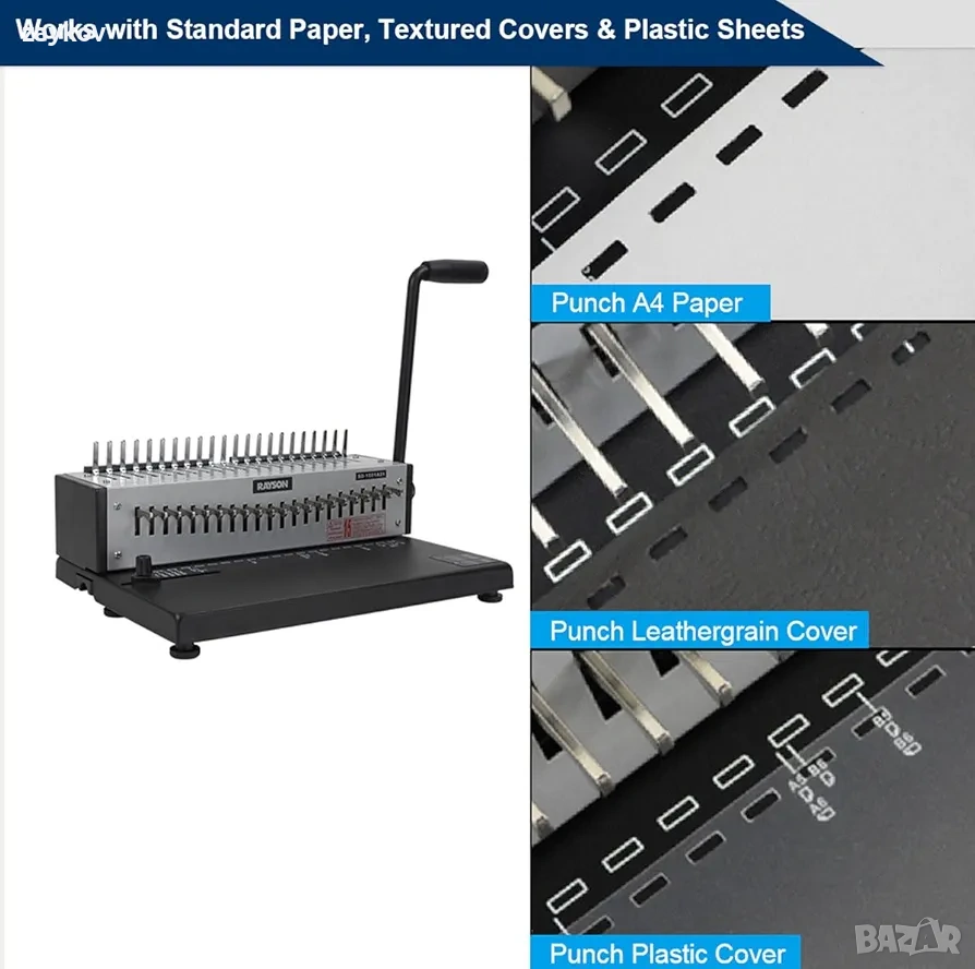 Висока ефективност] Способна да перфорира ръчно до 12 листа едновременно и да подвързва до 200 листа хартия 75 гр./м², тази машина също така без усилие перфорира 1 лист от пластмасова PVC подвързия за книги или подвързия A4 с кожена текстура на операция.