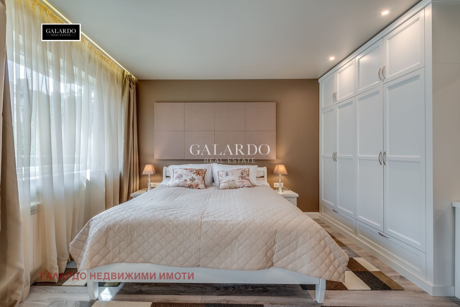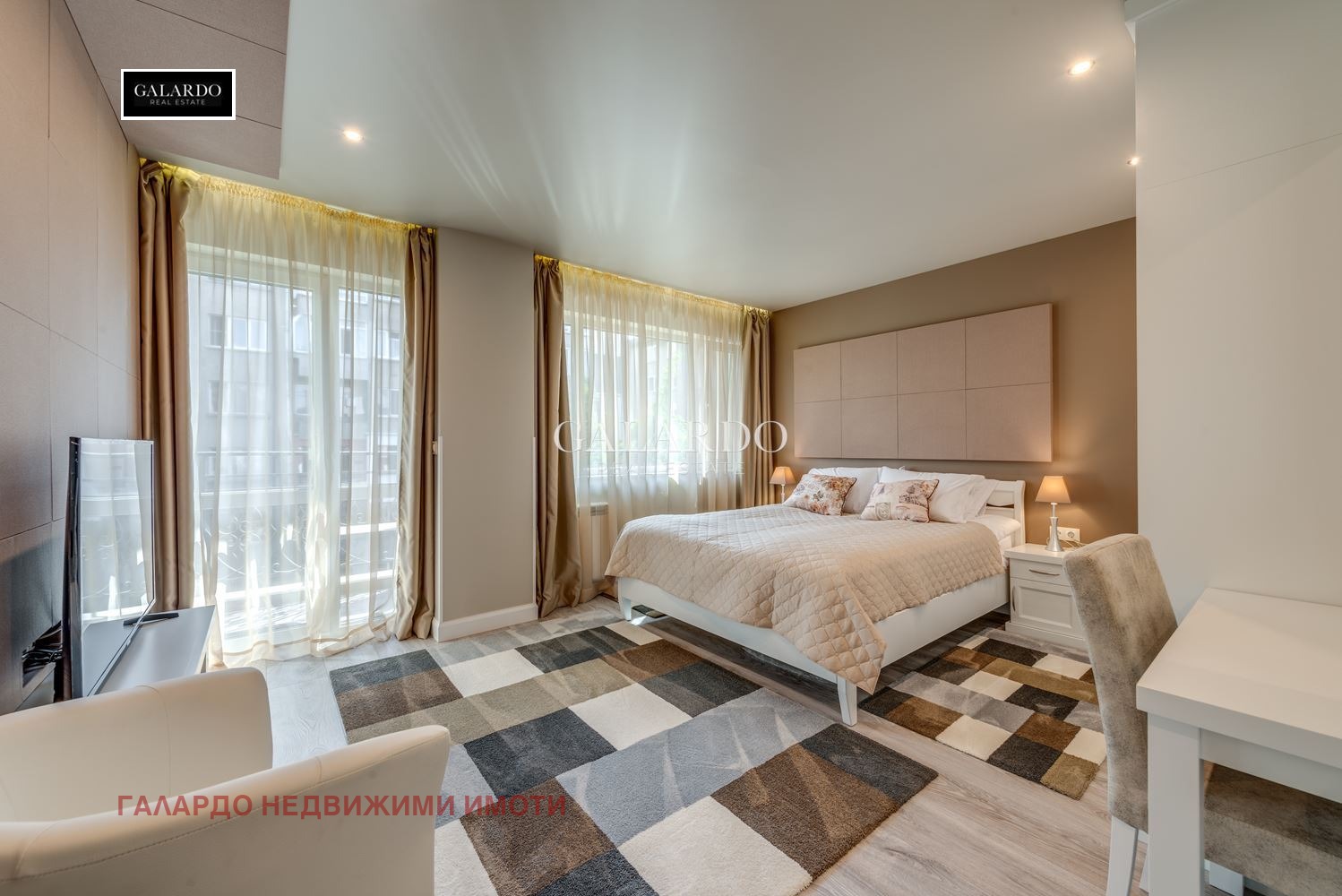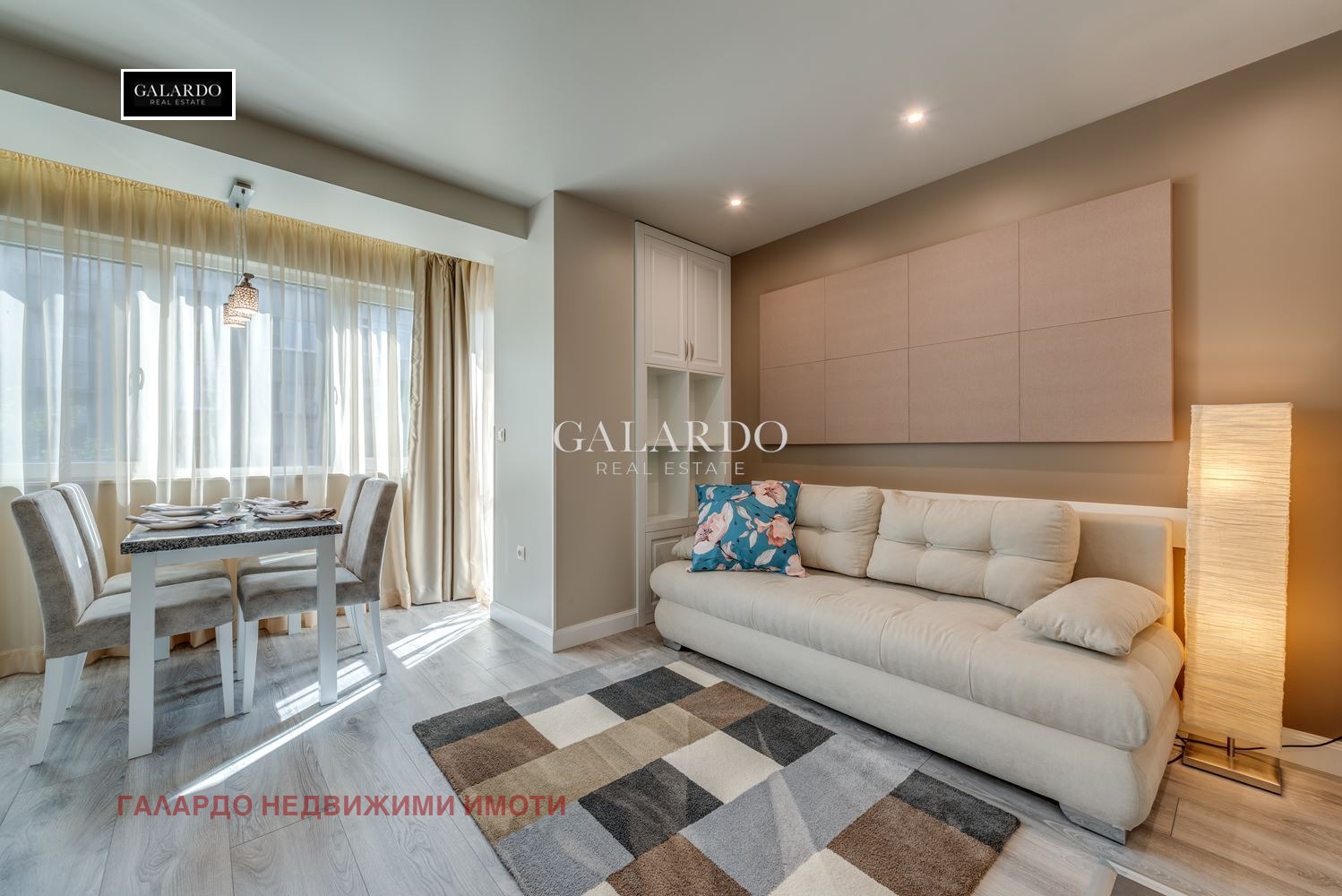 Galardo Real Estate има удоволствието да представи на Вашето внимание прекрасен двустаен апартамент на тиха улица близо до бул. Дондуков. Апартаментът е изцяло обзаведен и напълно оборудван с висок клас мебели и електроуреди, както и смарт телевизор, индивидуални рутери във всеки апартамент. Отоплението е с ТЕЦ, разполага с климатици и бойлер. Сградата разполага и със зала за масаж и има въжможност за записване на часове за масаж с предварителна заявка (срещу заплащане). Цената включва цялостно поддържане и почистване на хотелски принцип, както и всички режийни разходи на апартамента - ток, отопление, вода, интернет, СОТ, техническа поддръжка, както и поддръжка, почистване и обезпаразитяване на цялата сграда, ползване на прекрасен озеленен двор с беседка с отопление през зимата и охлаждане през лятото, парна баня и фитнес.