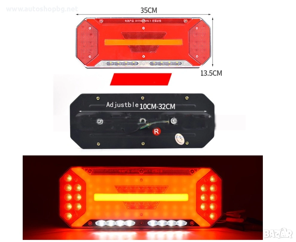 Диоден LED комплект задни стоп светлини с 5 функции и динамичен мигач, подходящ за камиони, ремаркета, каравани и платформи. Включва стоп/спирачка и габарит в червено, динамичен мигач в жълто и бяла неонова задна светлина. Здрав и водоустойчив корпус, захранване 24V. Цената е за комплект.