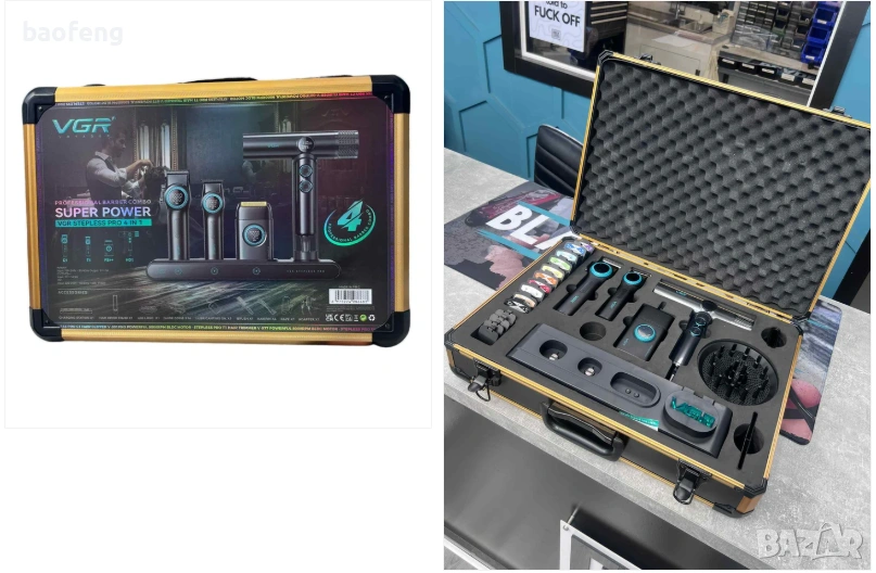 Комплектът съдържа: професионална машинка VGR PRO V-001 за подстригване, тример VGR V-977 за контури, шейвър VGR V-377 за гладко бръснене и йонен сешоар VGR V-401 за сушене и стилизиране. Всичко това е в куфар с зарядна база — идеално за домашна употреба и за барбъри, когато искате пълен комплект за коса и брада без компромиси.