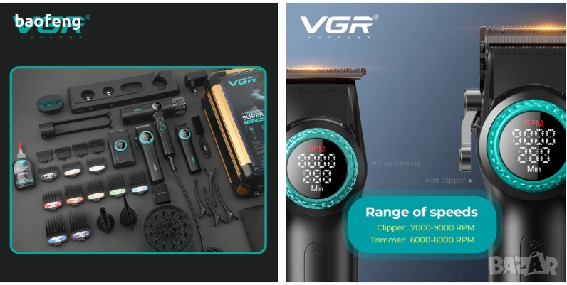 Машинката VGR PRO V-001: батерия 4600 mAh — до 300 минути работа, зареждане Type-C 3–6 ч. Тример V-977: 2500 mAh — до 260 минути, зареждане ~3,5 ч. Шейвър V-377: 1400 mAh — до 100 минути, зареждане ~2 ч. Сешоарът работи на мрежово захранване и няма батерия. Зарядната станция позволява удобно поставяне и зареждане на уредите.