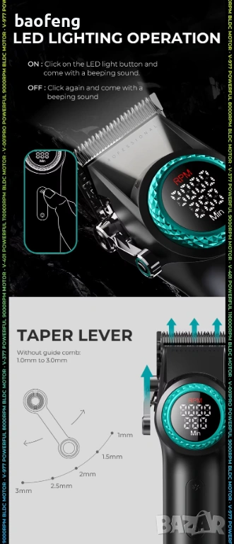 • Машинка VGR PRO V-001: Мощност 10W, BLDC мотор 7000–9000 RPM, батерия 4600 mAh, време на работа до 300 минути, зареждане Type-C (3–6 ч.), LED дисплей, 21 нива на скорост, регулиращ лост 1.0–3.0 mm, гребени 1.5–24 mm. Размер: 18.5 × 3.5 cm.