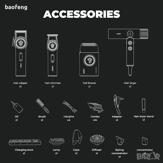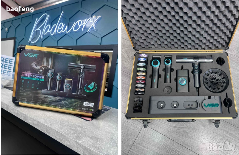 Комплектът съдържа: професионална машинка VGR PRO V-001 за подстригване, тример VGR V-977 за контури, шейвър VGR V-377 за гладко бръснене и йонен сешоар VGR V-401 за сушене и стилизиране. Всичко това е в куфар с зарядна база — идеално за домашна употреба и за барбъри, когато искате пълен комплект за коса и брада без компромиси.
