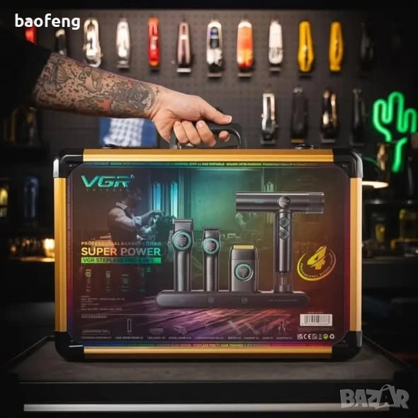 Комплектът съдържа: професионална машинка VGR PRO V-001 за подстригване, тример VGR V-977 за контури, шейвър VGR V-377 за гладко бръснене и йонен сешоар VGR V-401 за сушене и стилизиране. Всичко това е в куфар с зарядна база — идеално за домашна употреба и за барбъри, когато искате пълен комплект за коса и брада без компромиси.