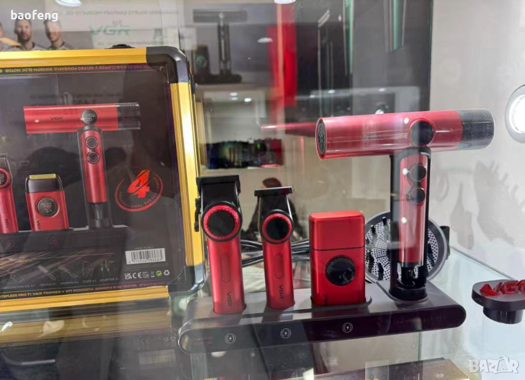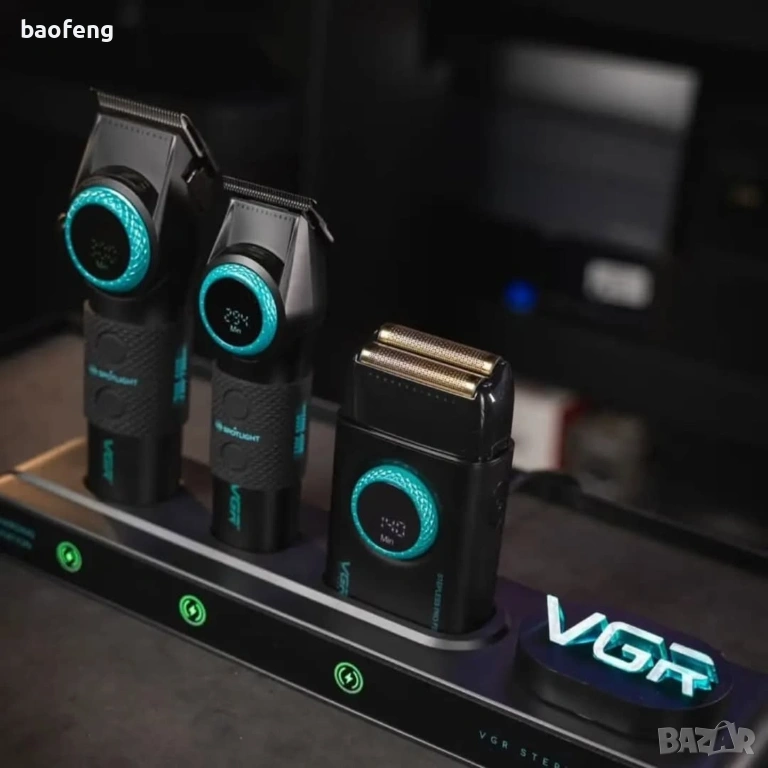 Машинката VGR PRO V-001: батерия 4600 mAh — до 300 минути работа, зареждане Type-C 3–6 ч. Тример V-977: 2500 mAh — до 260 минути, зареждане ~3,5 ч. Шейвър V-377: 1400 mAh — до 100 минути, зареждане ~2 ч. Сешоарът работи на мрежово захранване и няма батерия. Зарядната станция позволява удобно поставяне и зареждане на уредите.