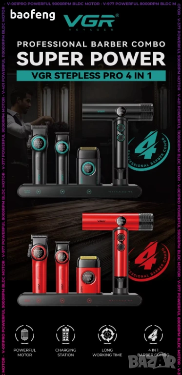 Професионален комплект VGR Stepless 4 в 1 е всичко, от което се нуждаете, за да превърнете дома или салона в арена на отлични резултати. Този комплект комбинира тример, шейвър, професионална машинка и турбо йонен сешоар в луксозен куфар с практична станция за зареждане. Ако търсите мощ, прецизност и издръжливост — изпитайте удоволствието от професионалния инструментариум, създаден за интензивна употреба. 4sales.bg ви предлага продукт, който отговаря на изискванията на барбъри и домашни ентусиасти, готов да даде перфектен контур, гладки линии и бързо сушене с салонно ниво на ефективност.