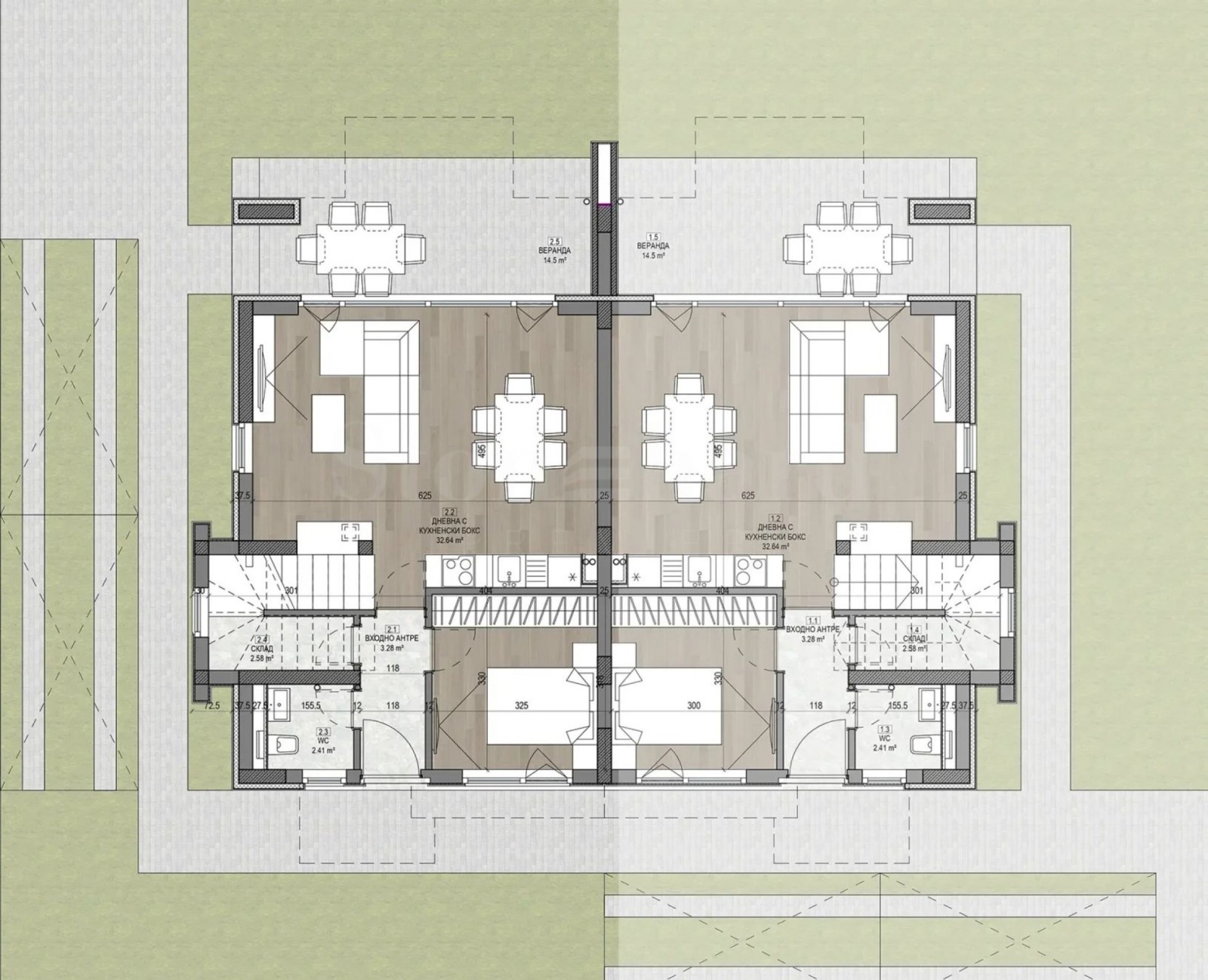 етаж 1: антре, дневна с кухня, санитарно помещение, веранда;