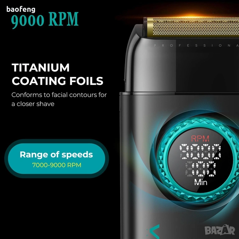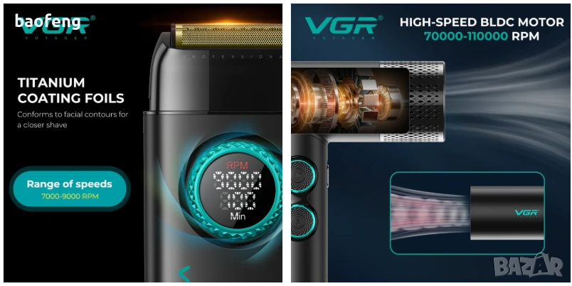 • Шейвър VGR V-377: Мощност 5W, двойни титаниеви фолиа, батерия 1400 mAh, работа до 100 минути, зареждане Type-C (2 ч.), 21 нива на скорост. Размер: 12.1 × 6.6 × 3.3 cm, тегло: 246 g.