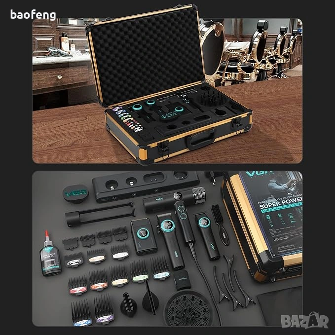 Комплектът съдържа: професионална машинка VGR PRO V-001 за подстригване, тример VGR V-977 за контури, шейвър VGR V-377 за гладко бръснене и йонен сешоар VGR V-401 за сушене и стилизиране. Всичко това е в куфар с зарядна база — идеално за домашна употреба и за барбъри, когато искате пълен комплект за коса и брада без компромиси.