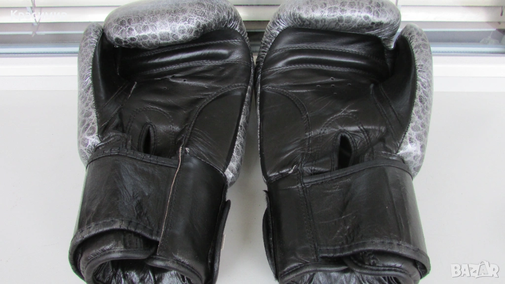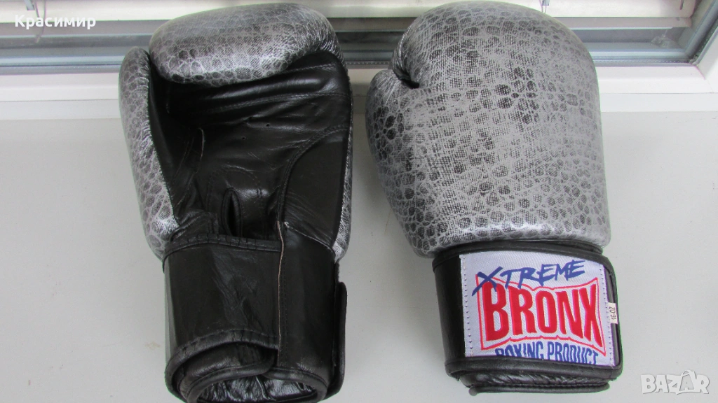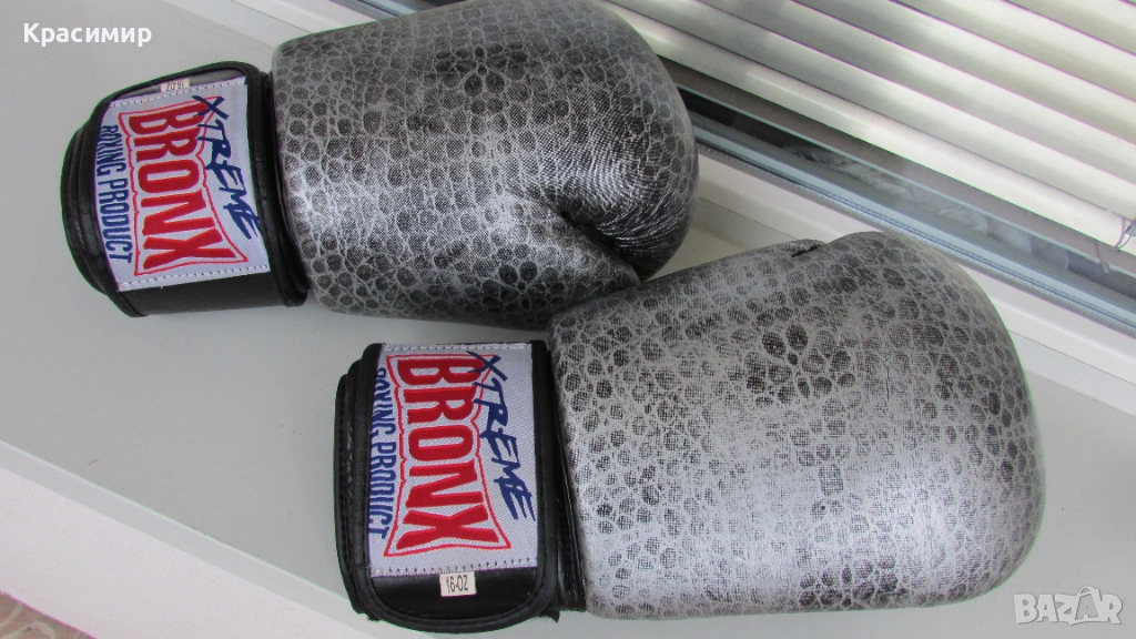 Боксови ръкавици Bronx Xtreme, с шарка тип змийска кожа. Изработени от естествена кожа, с дебела формована пяна, за омекотяване на удара, и анатомична форма на ръката за намаляне на умората. Закопчаването е със широка велкро лента за стабилност и плътност на китката. Подходящи за за бокс, кик бокс и тайландски бокс. Размер 16 OZ. Ръкавиците са в много - добро състояние, видимо на снимките. Цената е без коментар.