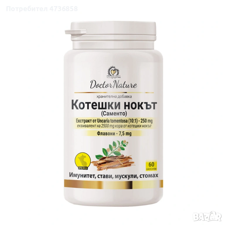 Действие: Dr. Nature Котешки нокът (Саменто) е естествен продукт, който съдържа стандартизиран екстракт от кора на Котешки нокът от Перу от вида Uncaria tomentosa. Той се отличава с ударно имуностимулиращо и противовъзпалително действие, докато видът Uncaria guianensis по-скоро се прилага като превенция. Билката съдържа над 100 полезни вещества, което ѝ носи титлата „Най-мощният природен имуностимулатор“.