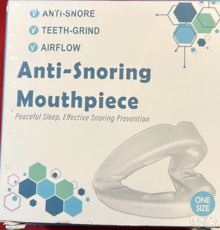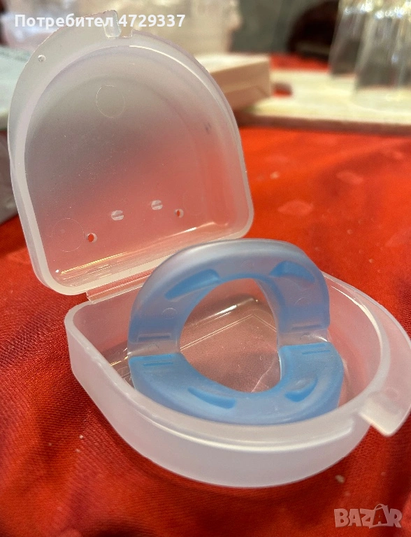 кутия с мундщук против хъркане (Anti-Snoring Mouthpiece), който е предназначен за подобряване на качеството на съня чрез предотвратяване на хъркането и скърцането със зъби.