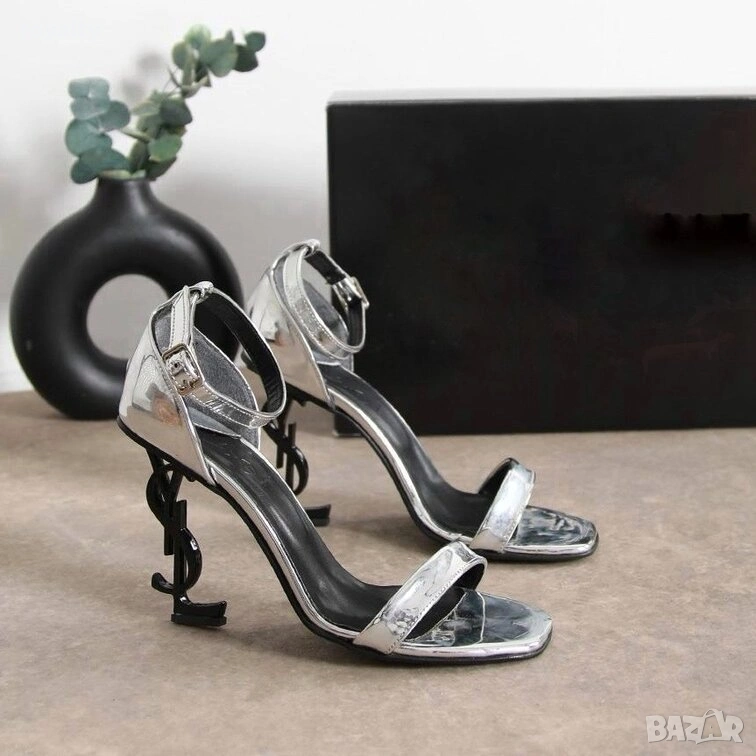 Yves Saint Laurent Сандали на ток - сребрист лак с черен ток YSL → Обява 53526010