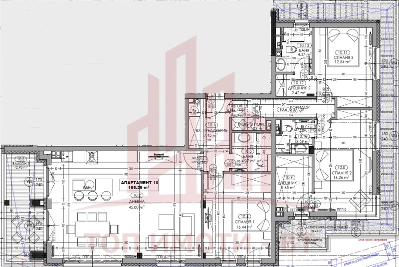 Непреходен 4-стаен апартамент с обща площ 188.72 (застроена площ 165.29) кв.м. на 4-ти надпартерен етаж плюс тераса с площ 29.45 кв.м.