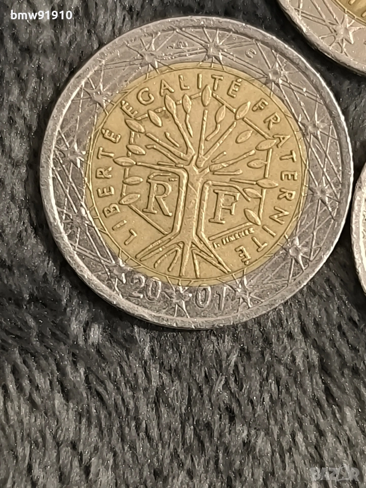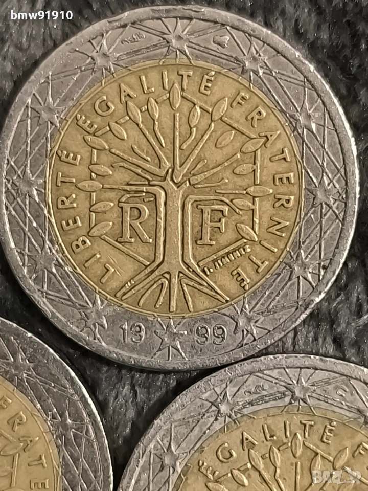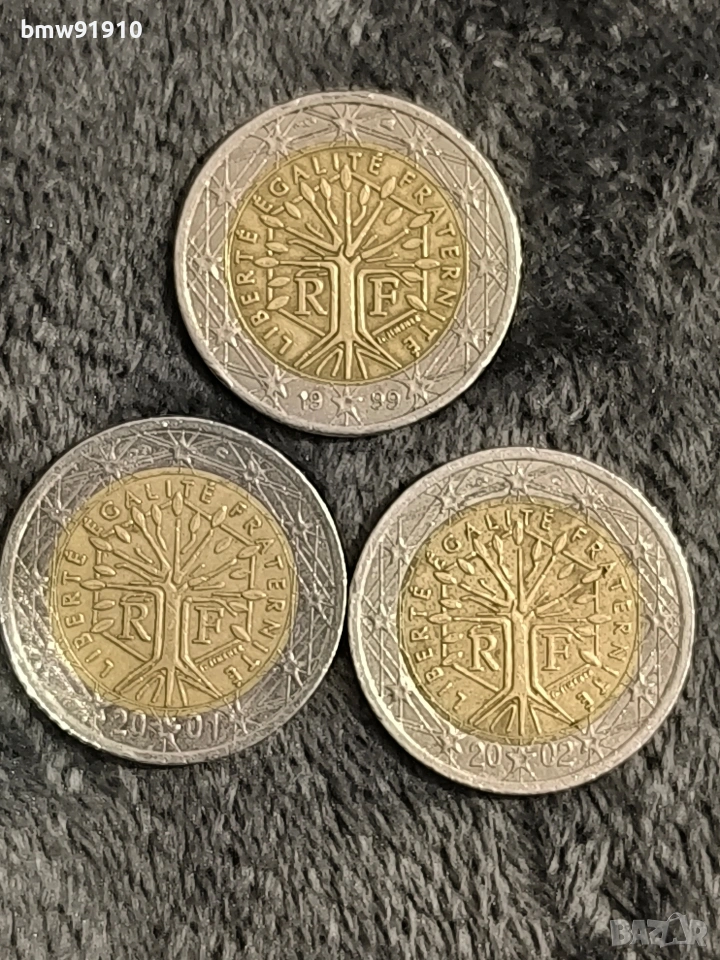 3 бр монети 1999,2001,2002г.Изобразява "дървото на живота" с буквите "RF" (République Française) отстрани, заобиколено от девиза "LIBERTÉ ÉGALITÉ FRATERNITÉ" (Свобода, равенство, братство) Цената е 25 евро за бройка.